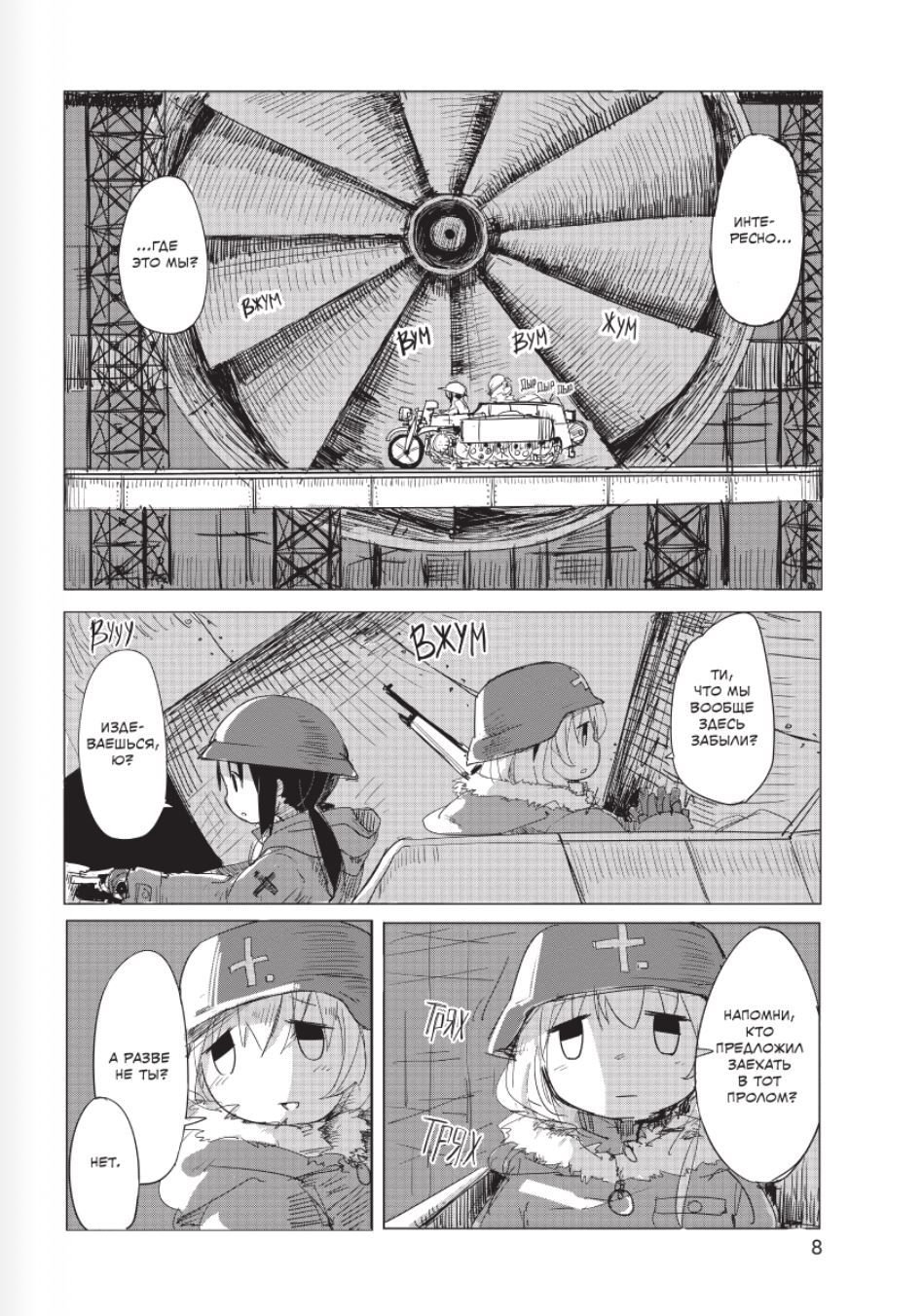 Viņas ar savu iecienīto motociklu "Kettenkrad" dodas cauri nedzīvu pilsētu drupām, meklējot pārtiku un degvielu. Pelēkas un bezcerīgas dienas mijas viena otrai, taču, kamēr meitenes ir kopā, pat vissmagākajos brīžos viņas atrod kaut ko gaišu. Un viņu sajūtas un pārdzīvojumi piepilda šo tukšo pasauli ar mirkļiem, kuru dēļ vēl ir vērts dzīvot.....