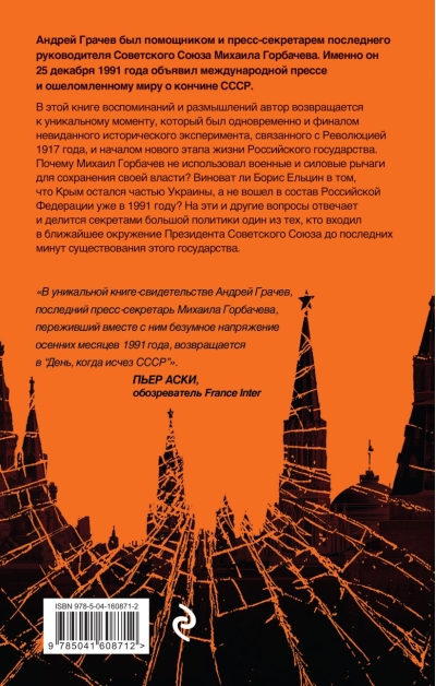 Pirms 30 gadiem sabruka Padomju Savienība. Nepieredzētais vēsturiskais eksperiments, ko aizsāka 1917. gada revolūcija, sabruka. Andrejs Gračevs bija Mihaila Gorbačova pēdējais preses sekretārs. Tieši viņš 1991. gada 25. decembrī starptautiskajai presei un pārsteigtajai pasaulei paziņoja par PSRS sabrukumu. Kāpēc Gorbačova perestroika - mēģinājums glābt valsti, to modernizējot, - beidzās ar dramatisku padomju impērijas sabrukumu? Kāpēc Mihails Gorbačovs nespēja izmantot militārās un varas sviras, lai saglabātu savu varu? Kuru rīcība vai bezdarbība noveda pie PSRS sabrukuma: konservatīvo, demokrātu, nacionālistu vai ārvalstu "labvēļu"? Uz šiem un citiem aktuāliem jautājumiem atbild viens no tiem, kas vadīja Padomju Savienību līdz tās pastāvēšanas pēdējām minūtēm, un dalās lielās politikas noslēpumos. Ir pagājuši trīs gadu desmiti - ar savu nekrologa grāmatu Andrejs Serafimovičs Gračevs beidzot aizvada PSRS vēsturē un piedāvā ieskatu nākotnē. Bez bailēm, bet arī bez ilūzijām.