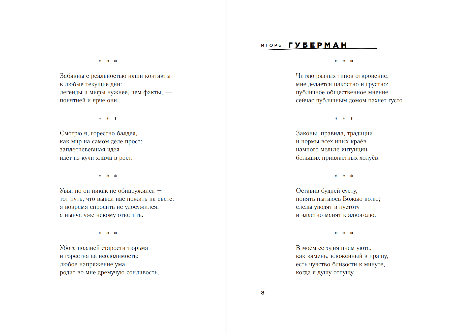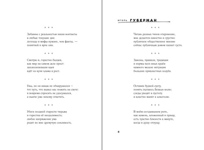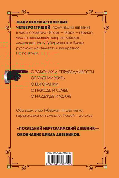 Šī nav Igora Gubermana pēdējā, bet gan jaunākā sarakstītā "Jeruzalemes dienasgrāmata". Tā ir viņa slaveno īso dzejoļu jeb "gariku" krājums. Tie ir par likumiem un taisnīgumu, dzīves mākslu, profesionālo un personīgo izdegšanu, cilvēkiem un ģimeni, cerību un veiksmi. Gubermans pieiet katrai tēmai ar humoru un neļauj mums justies skumji, pat rakstot par vecumdienām un nāvi.