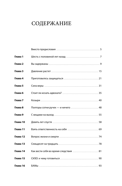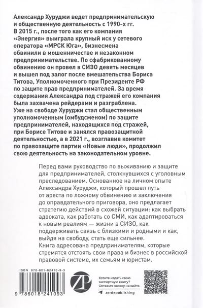 Šī grāmata satur atbildes uz svarīgākajiem jautājumiem: kā izvēlēties patiesi efektīvu advokātu un izveidot spēcīgu aizstāvību; kā izmantot sabiedriskās domas un mediju spēku; kā gudri sadalīt resursus, lai saglabātu savu biznesu; un, pats galvenais, kā pēc atbrīvošanas ne tikai atgūties, bet arī kļūt stiprākam, aizstāvot savu labo vārdu. Autors apraksta korporatīvo reidu, informācijas karu un psiholoģiskā spiediena mehānismus, ar ko saskaras uzņēmēji un viņu ģimenes, un piedāvā konkrētus risinājumus un piemērus no reālās dzīves prakses.