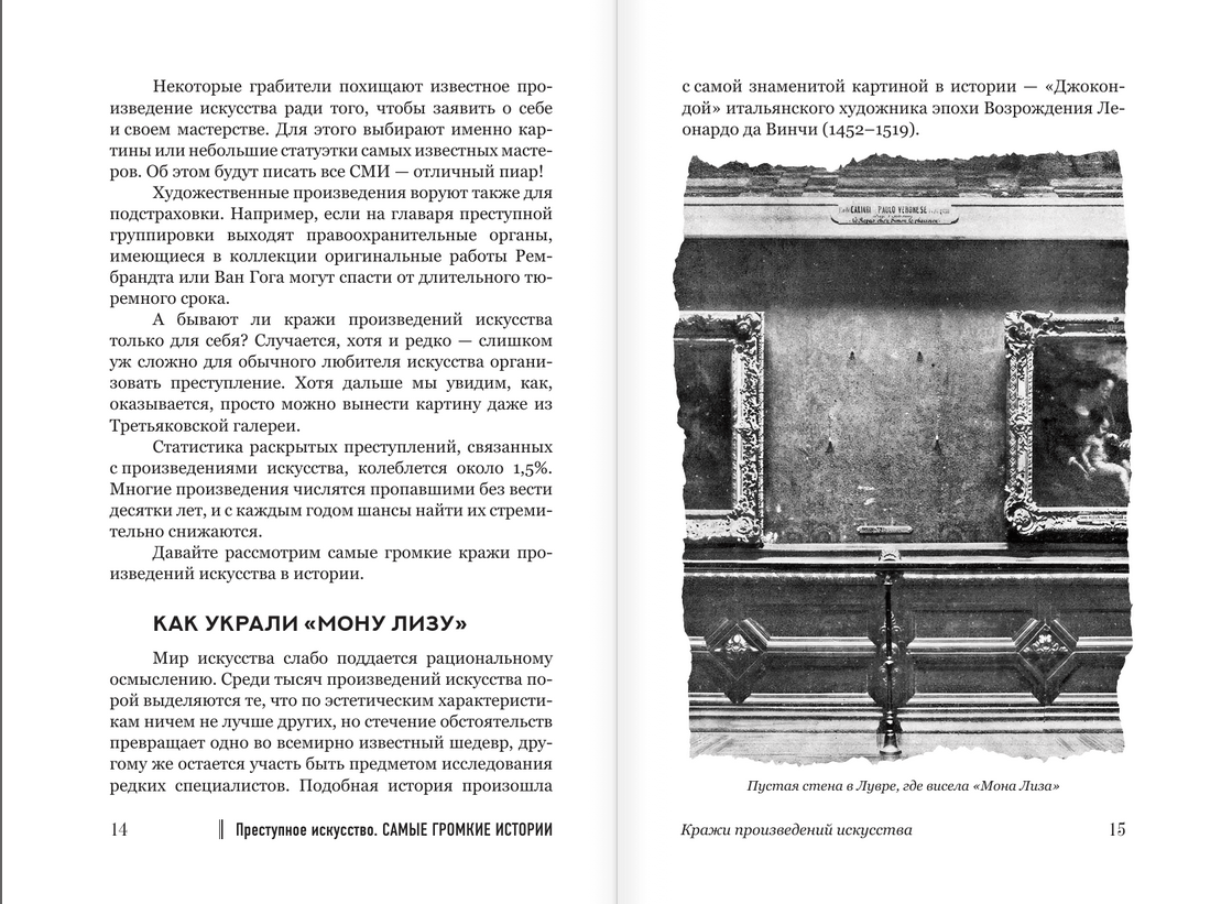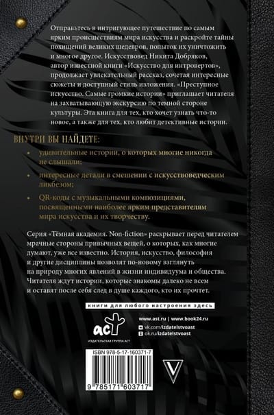 Piedzīvojiet intriģējošu ceļojumu pa mākslas pasaules spilgtākajiem atgadījumiem un atklājiet noslēpumus, kas saistīti ar lielu šedevru zādzībām, mēģinājumiem tos iznīcināt un daudz ko citu. Mākslas vēsturnieks Ņikita Dobrjakovs, atzītās grāmatas "Māksla introvertiem" autors, turpina aizraujošo stāstījumu, apvienojot interesantus sižetus un pieejamu izklāsta stilu. "Noziedzīga māksla. Skaļākie stāsti" aizved lasītāju aizraujošā ceļojumā pa kultūras tumšo pusi. Šī grāmata ir domāta tiem, kas vēlas uzzināt ko jaunu, kā arī tiem, kam patīk detektīvstāsti.