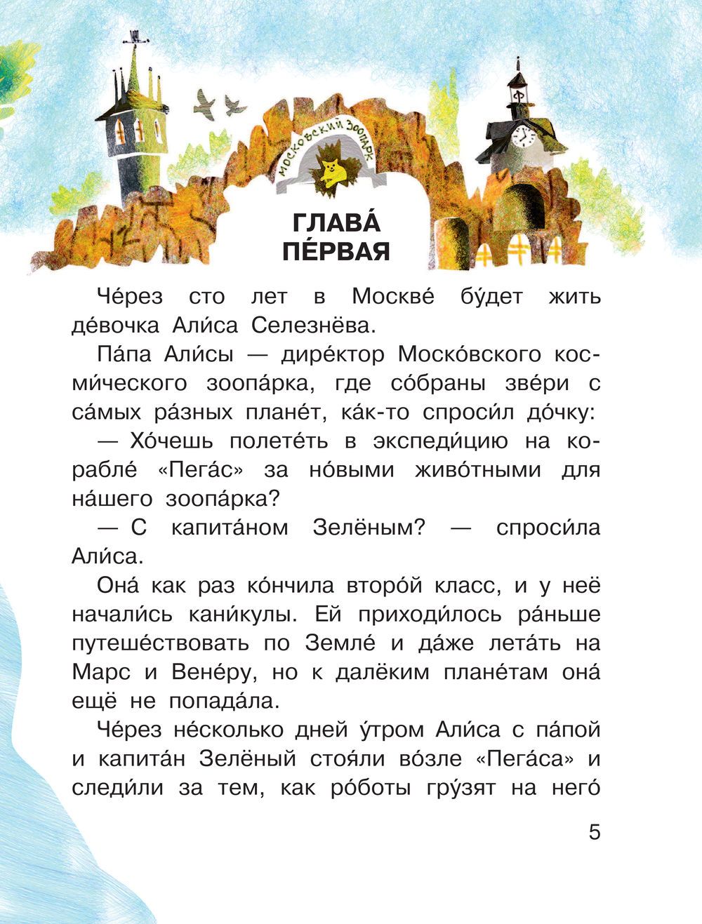 Grāmatā iekļauts fantastiskais stāsts "Trešās planētas noslēpums", kas jau kopš bērnības ir visu iemīļots slavenā rakstnieka Kira Buļičeva stāsts. Autors speciāli pielāgoja stāstu iesācējiem lasītājiem un uzrakstīja to pēc slavenā padomju multfilmas scenārija. Kopā ar nerātno un zinātkāro meiteni Alisi bērni dosies apbrīnojamu kosmosa radījumu meklējumos, atrisinās unikālo putnu - runātāju pazušanas noslēpumu un pat iesaistīsies cīņā ar nodevīgajiem pirātiem! Aizraujošie kosmosa piedzīvojumi iemācīs zēniem un meitenēm uzmanīgu attieksmi pret dzīvniekiem, savstarpēju palīdzību un draudzīgumu. Savukārt sižeta detektīvmīklas palīdzēs attīstīt izziņas spējas un inteliģenci. Lielie burti un uzsvari ļauj bērniem iepazīties ar slaveno darbu.