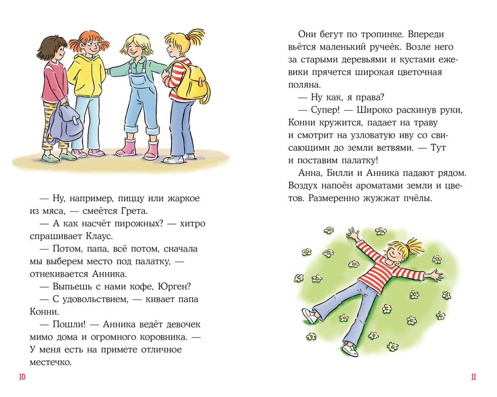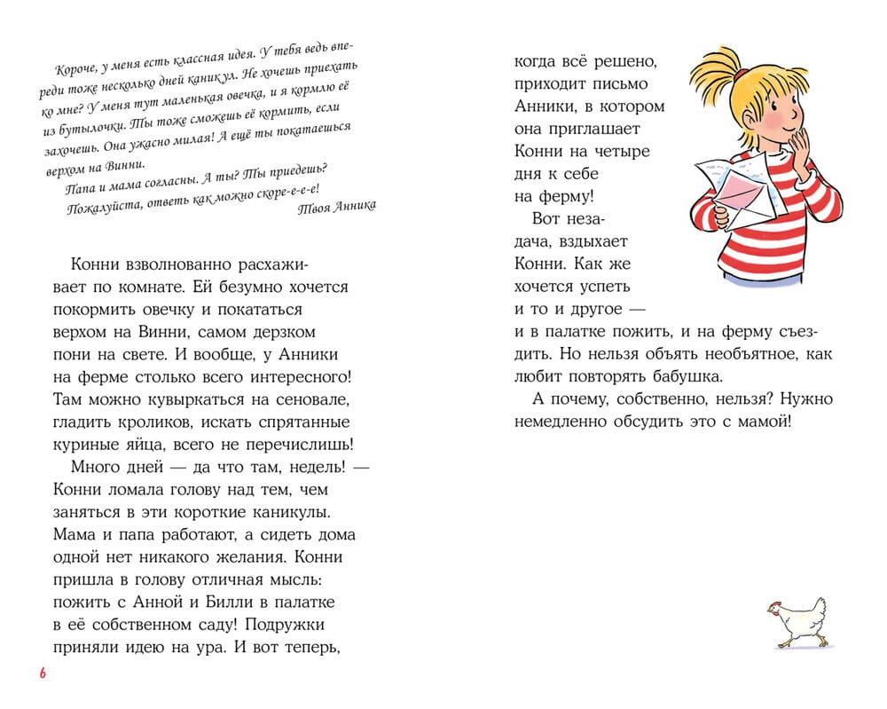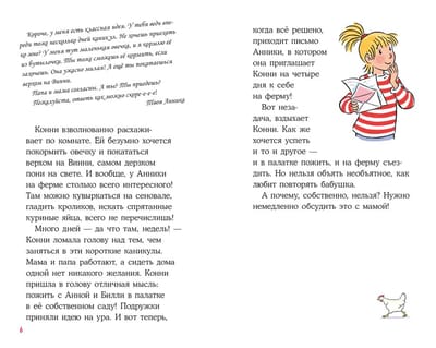 Konija un viņas skolas draugi Anna un Billijs dodas apciemot Anniku, kura dzīvo lielā saimniecībā: viņiem ir govis, kazas, aitas un vesels stallis. Meitenes gaida jautra diena, ja vien kaimiņos dzīvojošie zēni visu nesabojās. Stāsts par brīvdienām, zēnu un meiteņu konfrontāciju un draudzības uzvaru lasās viegli un ar prieku. Vecāki atcerēsies savas bērnības grāmatas, un bērni varoņu piedzīvojumos atpazīs pazīstamas situācijas.