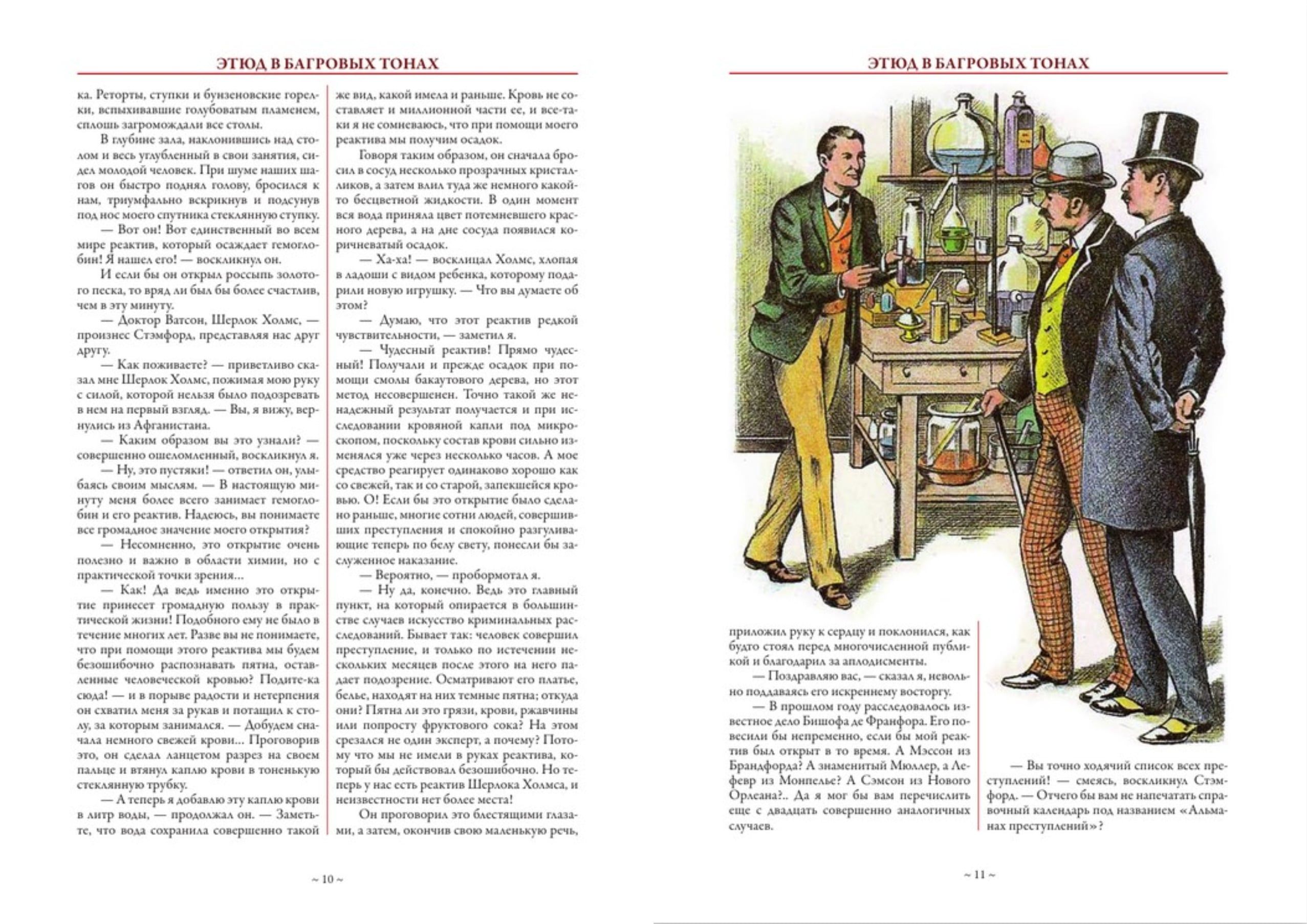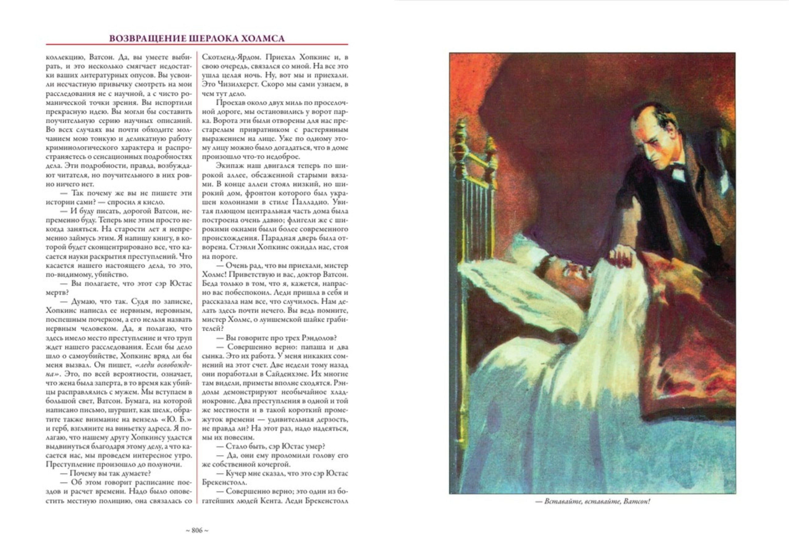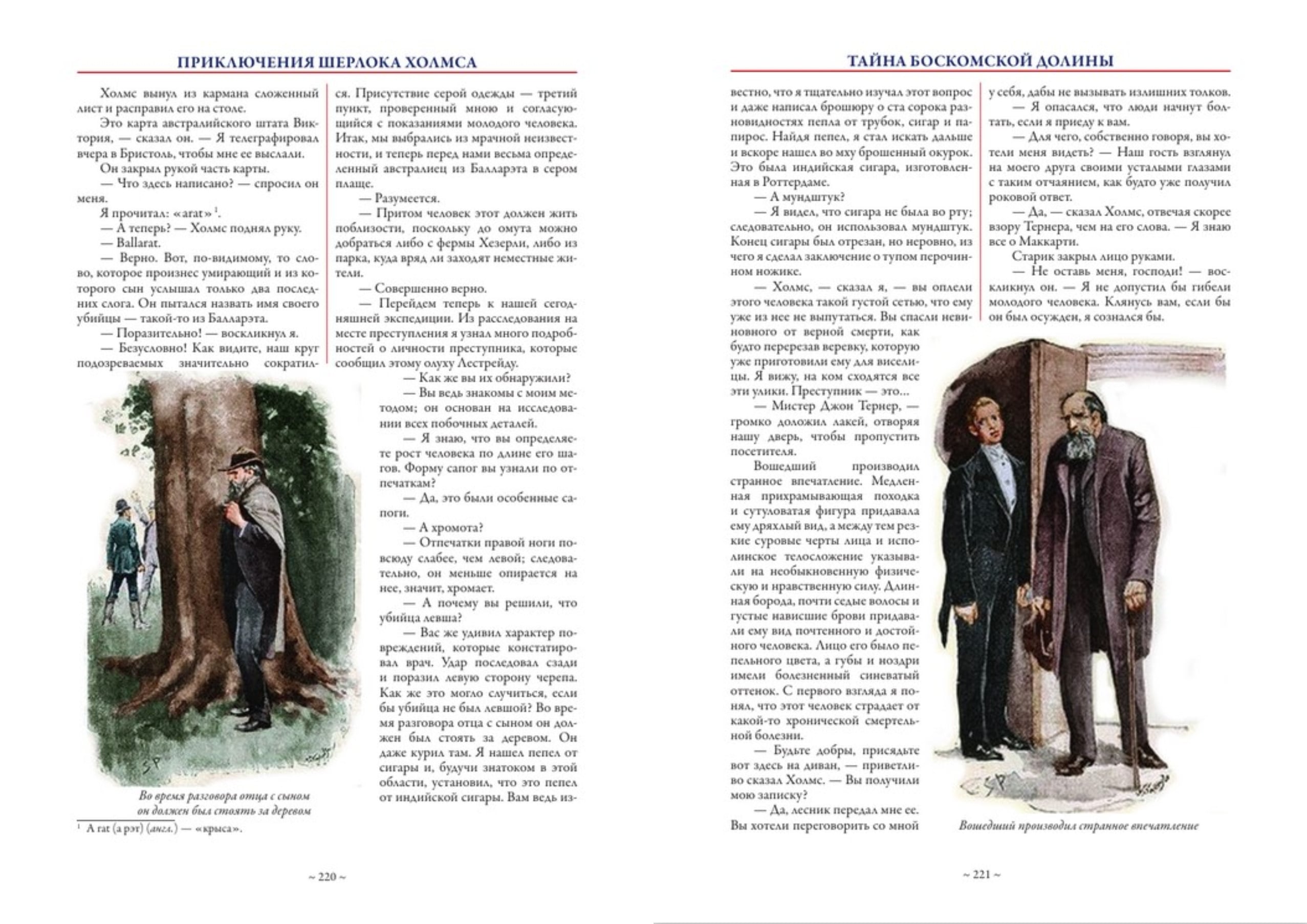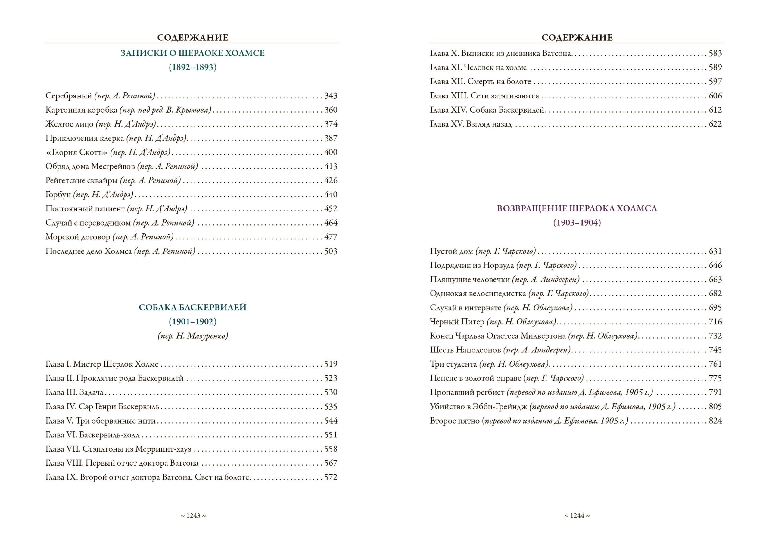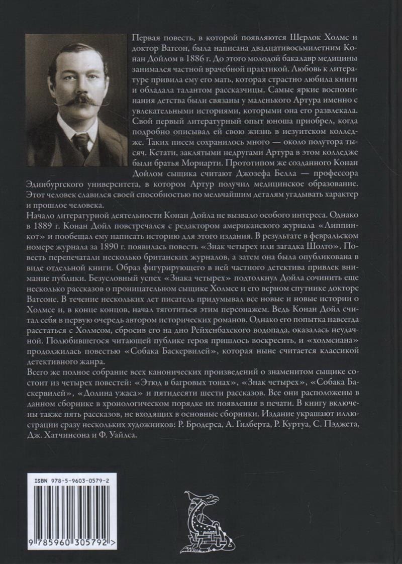 Šajā izdevumā iekļauti četri romāni par Šerloku Holmsu: "Pētījums purpursarkanajos toņos", "Četru zīme", "Baskervilu dzinējs", "Šausmu ieleja" un piecdesmit seši īsie stāsti, kas kopā veido pilnīgu visu kanonisko darbu krājumu par slaveno detektīvu. Tie visi krājumā sakārtoti hronoloģiskā secībā pēc to iznākšanas presē. Grāmatā iekļauti arī pieci stāsti, kas nav iekļauti galvenajos krājumos. Izdevumu rotā vairāku mākslinieku ilustrācijas: R. Brodersa, A. Žila, A. Pirmo stāstu, kurā parādās Šerloks Holmss un doktors Vatsons, divdesmit astoņus gadus vecais Konans Doils sarakstīja 1886. gadā. Pirms tam jaunais medicīnas bakalaurs bija nodarbojies ar privātpraksi. Mīlestību uz literatūru viņam ieaudzināja māte, kurai bija aizraušanās ar grāmatām un talants stāstīt stāstus. Visspilgtākās bērnības atmiņas saistījās ar mazo Artūru tieši ar aizraujošiem stāstiem, ar kuriem viņa viņu izklaidēja. Savu pirmo literāro pieredzi jauneklis guva, kad sīki aprakstīja viņai savu dzīvi jezuītu koledžā. Šādu vēstuļu ir saglabājies daudz - aptuveni pusotrs tūkstotis. Starp citu, Artūra zvērināti ienaidnieki šajā koledžā bija brāļi Moriarti. Konana Doila radītā detektīva prototips ir Džozefs Bells, Edinburgas universitātes profesors, kurā Artūrs ieguva medicīnisko izglītību. Šis vīrs bija slavens ar savu spēju pēc mazākajām detaļām uzminēt cilvēka raksturu un pagātni. konana-Doila literārās darbības sākums lielu interesi neizraisīja. Tomēr 1889. gadā Konans Doils tikās ar amerikāņu žurnāla "Lippincote" redaktoru un apsolīja viņam uzrakstīt stāstu šim žurnālam. Tā rezultātā 1890. gada februāra žurnāla numurā parādījās stāsts "Četru zīme jeb Šolto noslēpums". Stāsts tika pārpublicēts vairākos britu žurnālos un vēlāk izdots kā atsevišķa grāmata. Privātā detektīva tēls tajā piesaistīja sabiedrības uzmanību. "Četru zīmju" neapšaubāmie panākumi pamudināja Doilu uzrakstīt vēl vairākus stāstus par asprātīgo detektīvu Holmsu un viņa uzticamo kompanjonu doktoru Vatsonu. Vairāku gadu garumā rakstnieks izdomāja arvien jaunus stāstus par Holmsu un beigu beigās sāka nogurt no šī varoņa. Galu galā Konans Doils uzskatīja sevi galvenokārt par vēsturisko romānu autoru. Tomēr viņa mēģinājums uz visiem laikiem šķirties no Holmsa, iemetot viņu Reihenbaha ūdenskrituma dibenā, bija neveiksmīgs. Lasītāju publikas iemīļoto varoni nācās atdzīvināt, un "Holmsiana" turpinājās ar stāstu "Baskervilu dzinējs", kas mūsdienās tiek uzskatīts par detektīvžanra klasiku. kopumā visu kanonisko darbu par slaveno detektīvu pilno krājumu veido četri romāni: "Pētījums tumšajos toņos", "Četru zīme", "Baskervilu dzinējs", "Šausmu ieleja" un piecdesmit seši stāsti. Tie visi šajā krājumā sakārtoti hronoloģiskā secībā pēc to iznākšanas presē. Iekļauti arī pieci stāsti, kas nav iekļauti galvenajos krājumos. Izdevumu rotā vairāku mākslinieku ilustrācijas: R. Brodersa, A. Žila, A. Brodersa, A. Žila, R. Brodersa un A. Žila. Brodersa, A. Gilberta, R. Kurtuā, S. Pageta, J. Hačinsona un F. Vailsa.Piegāde un apmaksaAtgriezeniskā saiteKontakti