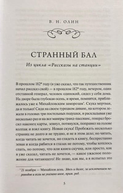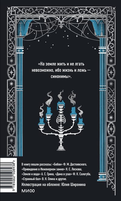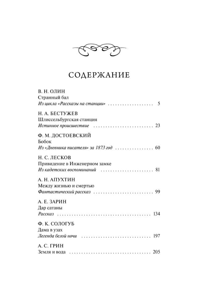Grāmatā iekļauti F. M. Dostojevska stāsti, N. S. Leskova "Spoks inženiera pilī", A. S. Grīna "Zeme un ūdens", F. K. Sologuba "Dāma važās" un V. N. Olina "Dīvainā balle", kā arī citi. Izdevums ir veidots klasiskā dizainā, ko veidojis mūsdienu mākslinieks.
