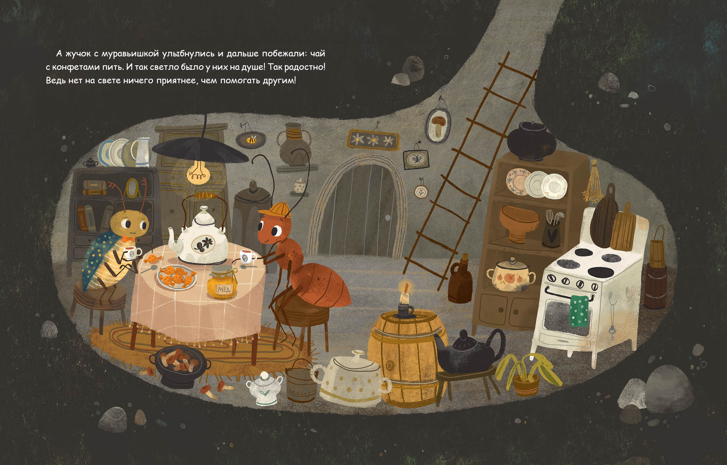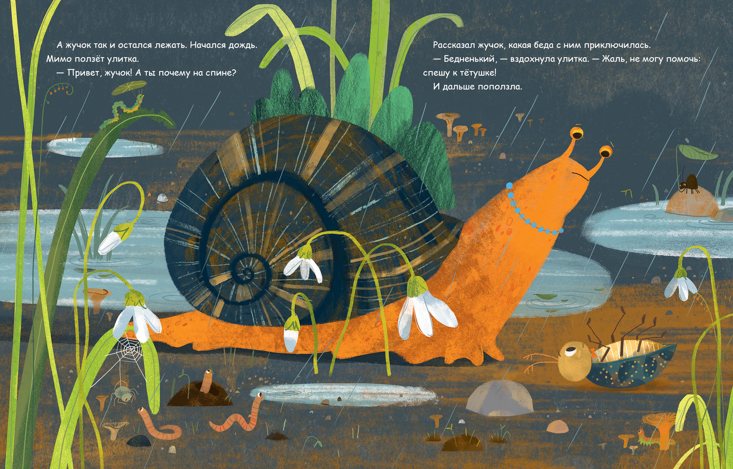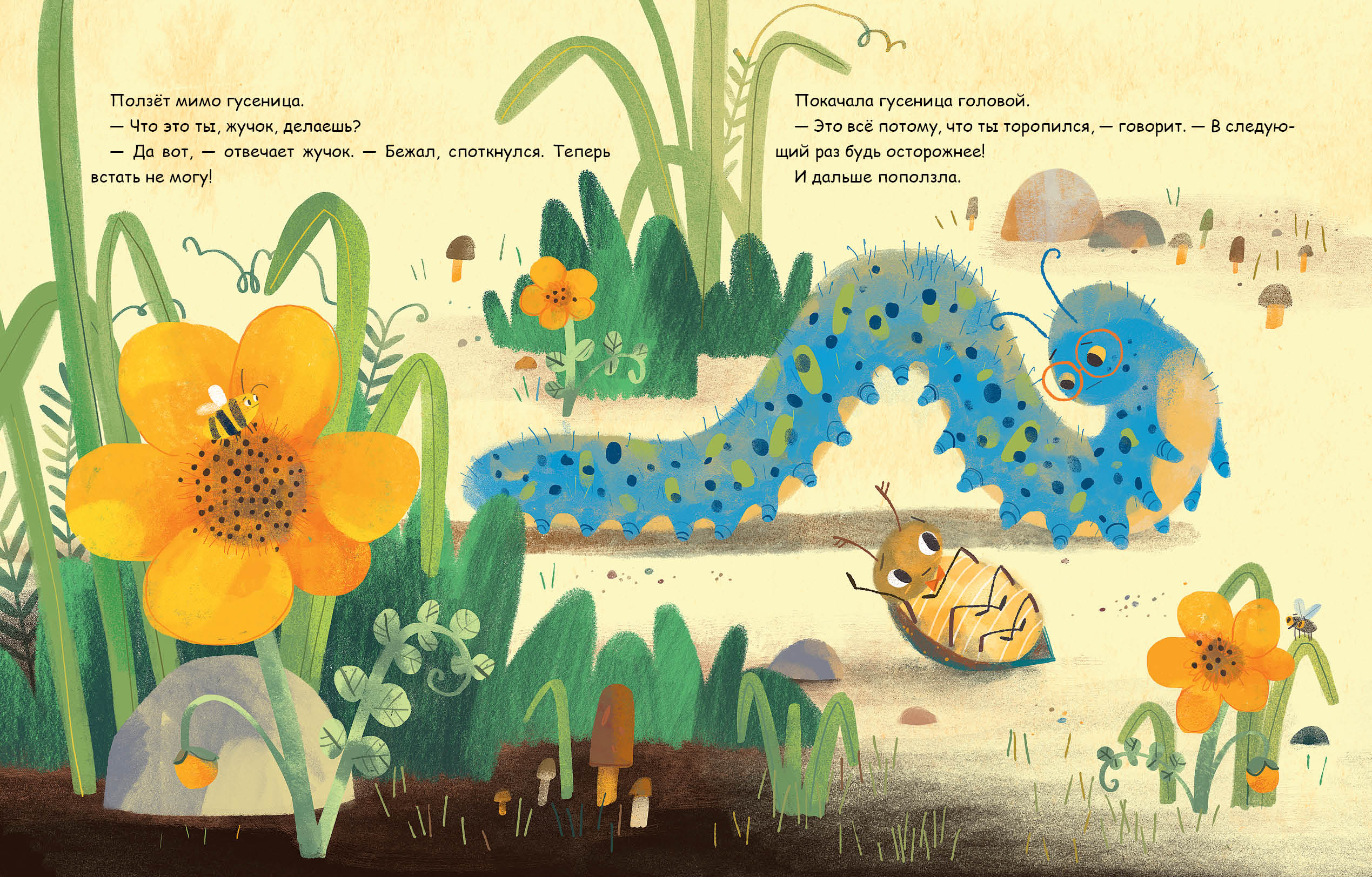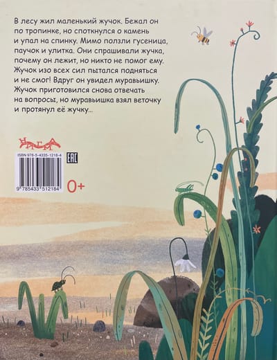 Mežā dzīvoja maza vabolīte. Viņš skrēja pa taku, kad paklupa aiz akmens un nokrita atpakaļ. Garām rāpoja kāpurs, zirneklis un gliemezis. Viņi jautāja vabolei, kāpēc tā tur guļ, bet neviens viņam nepalīdzēja. Vabolīte centās piecelties, bet nevarēja! Pēkšņi tā ieraudzīja skudru. Vabolīte gatavojās atkal atbildēt uz jautājumiem, bet skudra paņēma zariņu un pasniedza to vabolei...