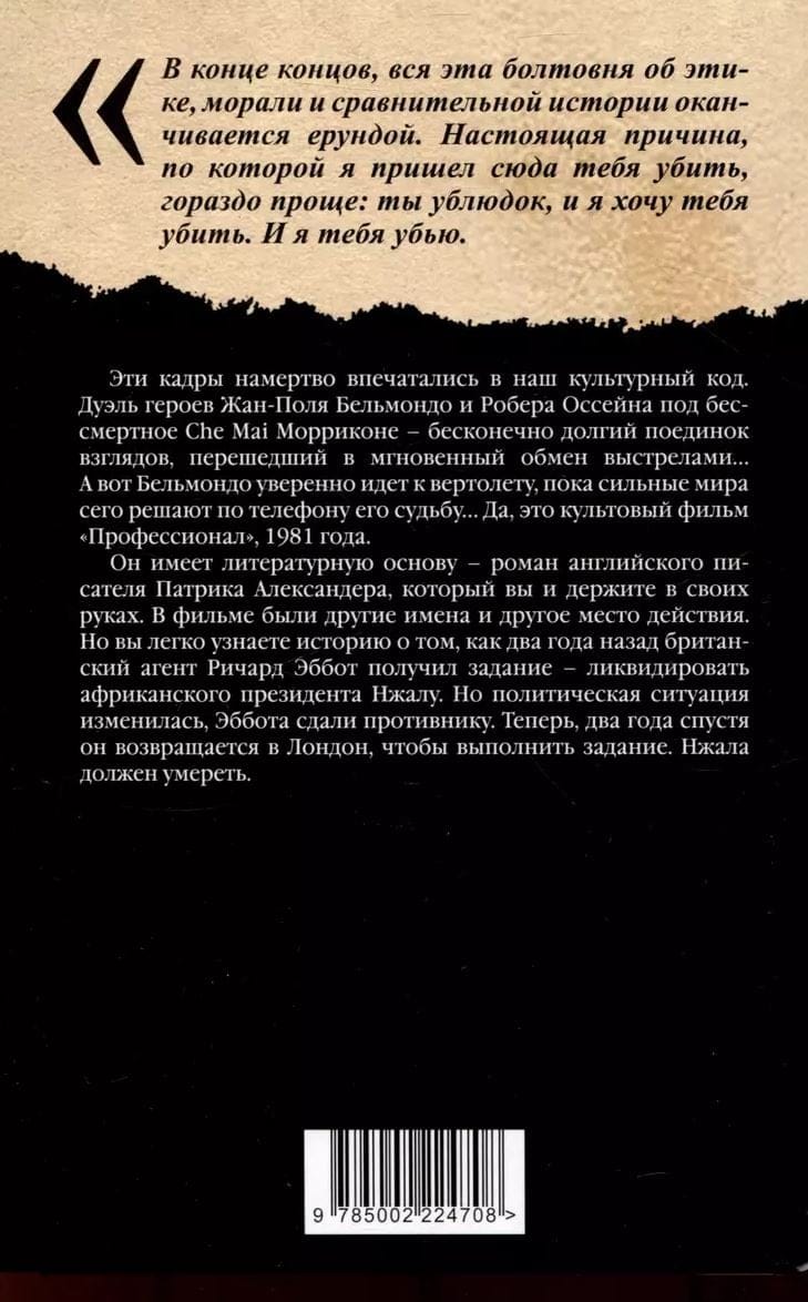 Šie tēli ir stingri iespiesti mūsu kultūras kodā. Žana Pola Belmondo un Roberta Oseina duelis pie Morikones nemirstīgās Che Mai - bezgalīgi ilga skatienu divcīņa, kas pārtop acumirklīgā kadru apmaiņā... Un te Belmondo pārliecinoši dodas helikoptera virzienā, kamēr varas pārstāvji pa telefonu lemj viņa likteni... Jā, tā ir 1981. gada kulta filma Profesionālis. Tai ir literārs pamats - angļu rakstnieka Patrika Aleksandra romāns, kuru jūs turat rokās. Filmai bija citi nosaukumi un cita vieta. Taču jūs viegli atpazīsiet stāstu par to, kā pirms diviem gadiem britu aģentam Ričardam Abotam tika dots uzdevums - likvidēt Āfrikas prezidentu Njalu. Taču politiskā situācija mainījās, un Abbots tika nodots ienaidniekam. Tagad, divus gadus vēlāk, viņš atgriežas Londonā, lai pabeigtu uzdevumu. Njalai ir jāmirst.