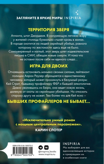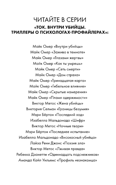 Izcils psiholoģisks trilleris par viltīga sērijveida slepkavas un bijušā profilētāja konfrontāciju. Lai to uzrakstītu, autore trenējās pie pasaulslavenā kriminologa un profilētāja Brenta Tērvija. Viņa arī pabeidza tiesībaizsardzības iestāžu kursus sērijveida slepkavību izmeklēšanā un strādāja privātdetektīvu firmā.