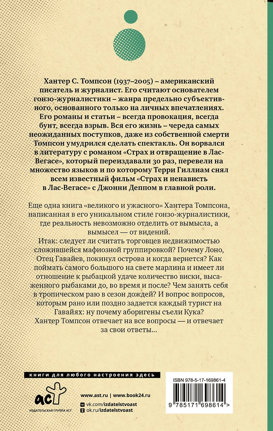 Vēl viena "lielā un briesmīgā" Hantera Tompsona grāmata, kas sarakstīta viņa unikālajā gonzo žurnālistikas stilā, kur realitāti nevar atdalīt no daiļliteratūras un daiļliteratūru no vīzijām. Tātad: vai nekustamo īpašumu brokeri jāuzskata par iedibinātu mafijas grupu? Kāpēc Lono, Havaju salu tēvs, pameta salas — un kad viņš atgriezīsies? Kā noķert pasaulē lielāko marlīnu, un vai viskija daudzumam, ko zvejnieki nozvejojuši pirms, laikā un pēc tam, ir kāda ietekme uz makšķerēšanas panākumiem? Ko darīt tropiskajā paradīzē lietus sezonā? Un jautājumu jautājums, ko agrāk vai vēlāk uzdod katrs tūrists, kas apmeklē Havaju salas: kāpēc vietējie iedzīvotāji ēda Kuku?
