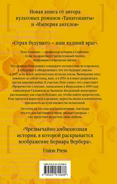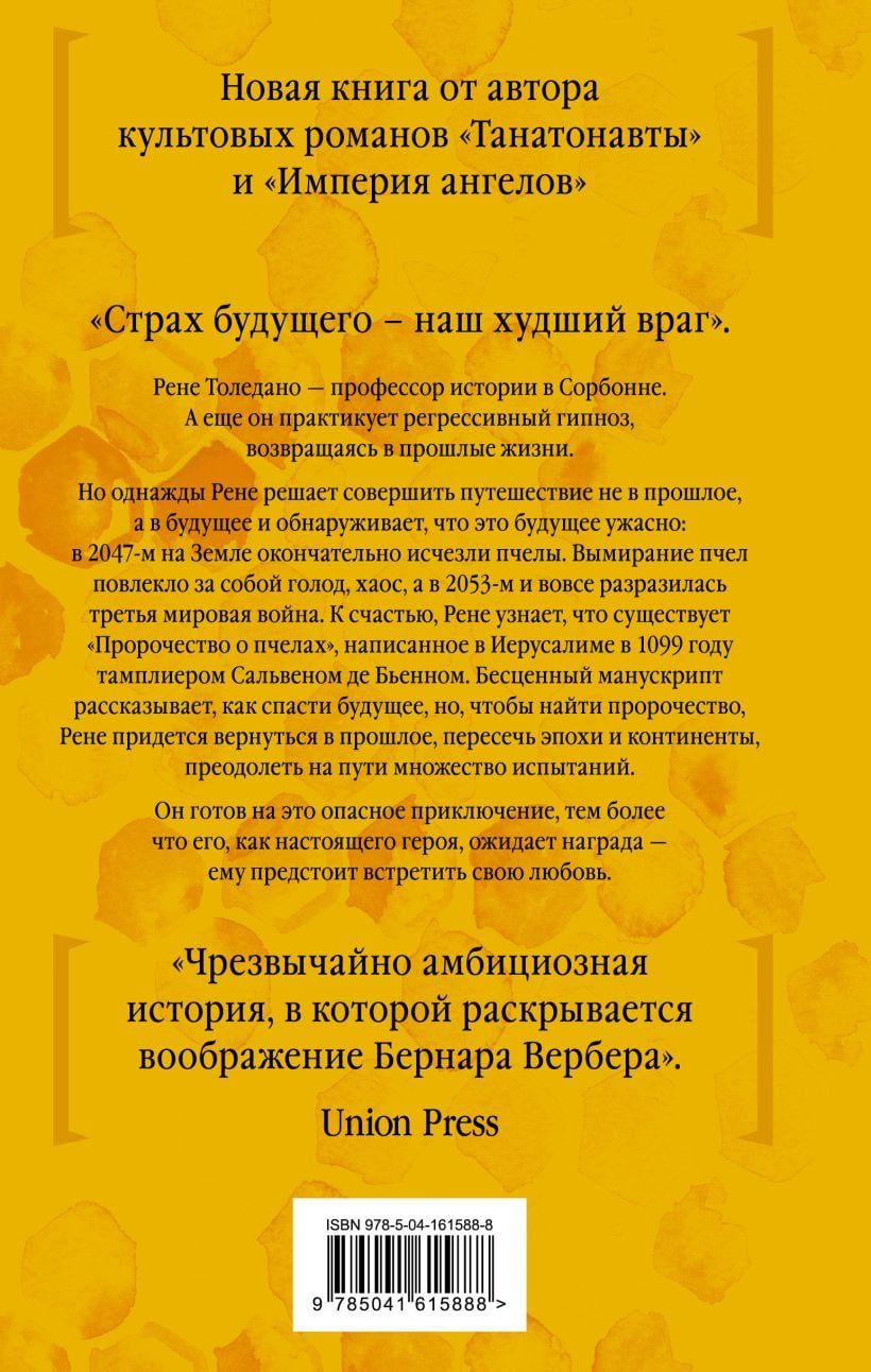Renē Toledano ir Sorbonnas vēstures profesors. Viņš praktizē arī regresīvo hipnozi, kas ļauj atgriezties iepriekšējās dzīvēs. Taču kādu dienu Renē nolemj ceļot nevis pagātnē, bet gan nākotnē, un ar šausmām atklāj, ka šī nākotne ir briesmīga: 2047. gadā beidzot no zemes pazuda bites, un vienas bioloģiskās sugas izzušana izraisīja badu, haosu un galu galā izcēlās trešais pasaules karš. Par laimi, Renē uzzina, ka ir "Bišu pravietojums", ko Jeruzalemē 1099. gadā sarakstījis templietis Salvins de Bjēns. Šis teksts stāsta, kā glābt nākotni. Tomēr, lai atrastu šo nenovērtējamo manuskriptu, Renē būs jāatgriežas pagātnē, jāšķērso laikmeti un kontinenti un jāpārvar daudzi pārbaudījumi. Viņš ir gatavs šim bīstamajam piedzīvojumam, jo uz spēles ir likts cilvēces liktenis.