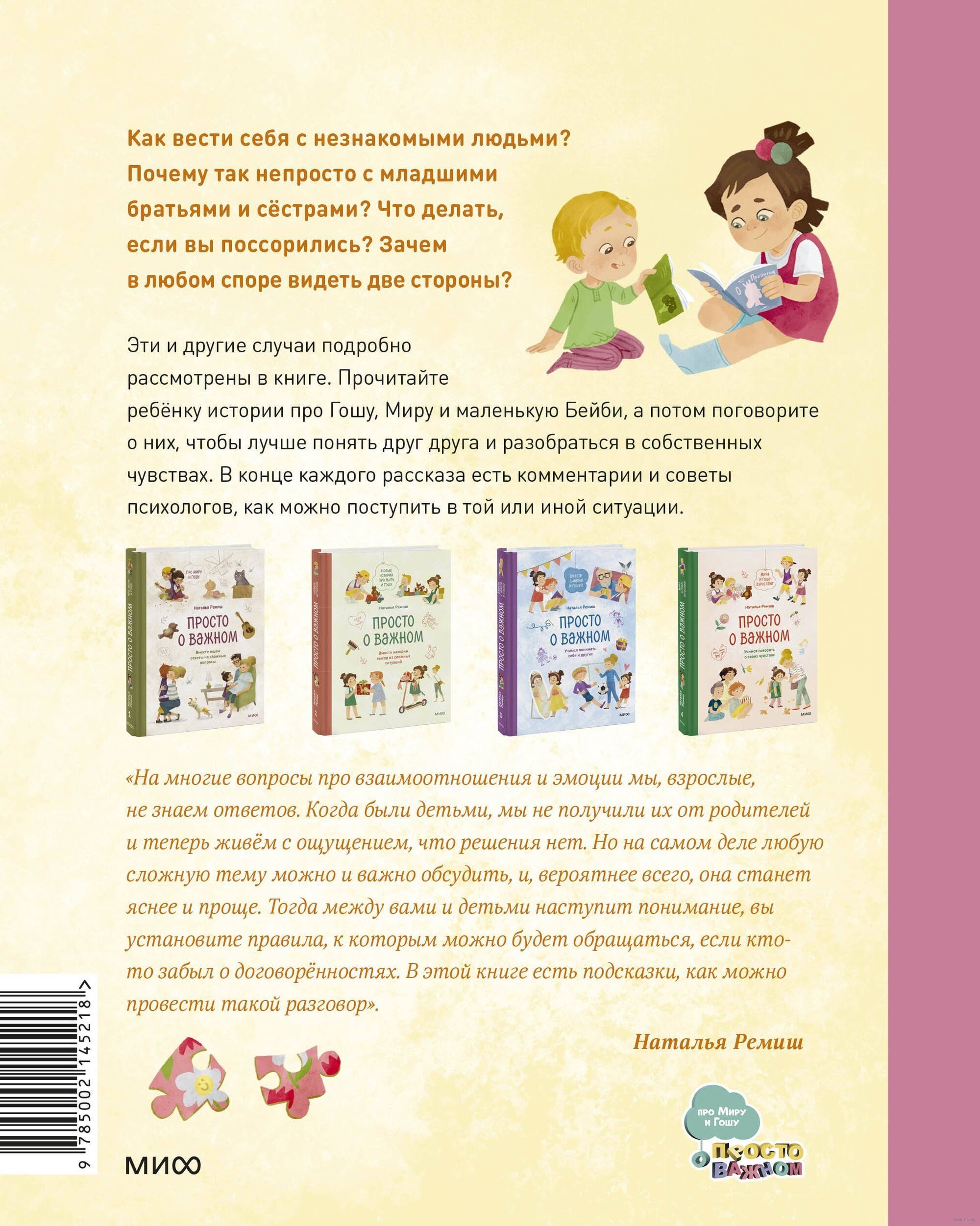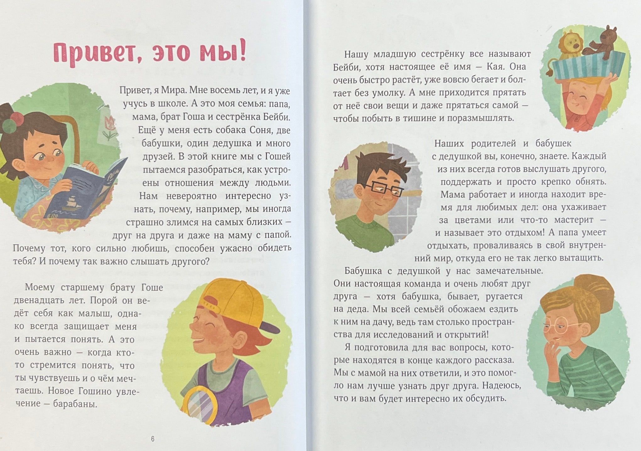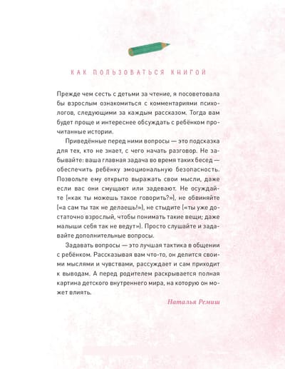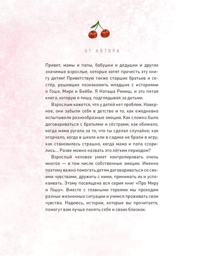 ? Šajā grāmatā jūs atradīsiet atbildes uz šiem un daudziem citiem jautājumiem. Izlasiet savam bērnam stāstus par Gošo, Miru un mazo Bēbīti un pēc tam pārrunājiet tos, lai labāk saprastu viens otru un izprastu savas emocijas un jūtas. Katra stāsta beigās ir psihologu komentāri un padomi, kā vislabāk nostāties tajā vai citā situācijā. "Uz daudziem jautājumiem par attiecībām un emocijām mēs, pieaugušie, nezinām atbildes. Kad bijām bērni, mēs nesaņēmām šīs atbildes no saviem vecākiem, un tagad dzīvojam ar sajūtu, ka nav risinājuma. Taču patiesība ir tāda, ka jebkuru sarežģītu tēmu var un vajag pārrunāt, un, visticamāk, tā kļūs skaidrāka un vienkāršāka. Tad starp jums un bērniem būs sapratne, un jums būs iedibināti noteikumi, uz kuriem atsaukties, ja kāds no jums aizmirsīs vienošanos. Šajā grāmatā ir sniegti padomi, kā veikt šādu sarunu."