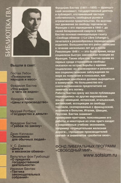 Frederiks Bastiats (1801–1850) bija franču ekonomists, valstsvīrs un publicists, kurš aizstāvēja privātīpašumu, brīvo tirgu un ierobežotu valdību. Viņš vadīja brīvās tirdzniecības kustību Francijā no tās pirmsākumiem 1840. gadā līdz pat savai pāragrajai nāvei 1850. gadā. Bastiats nodibināja nedēļas laikrakstu "Le Libre Echange" un rakstīja dažādiem periodiskiem izdevumiem. Lielākā daļa viņa darbu tika sarakstīti pirms un pēc 1848. gada revolūcijas — laikā, kad sociālisms Francijā strauji ieguva popularitāti. Tādējādi Bastiats bija viens no pirmajiem brīvās tirdzniecības atbalstītājiem, kas bija cīņas pret sociālisma idejām priekšgalā: viņš analizēja un skaidroja visas sociālistiskās maldības, tiklīdz tās parādījās, parādot, kā sociālisms neizbēgami degradējās komunismā. Tomēr lielākā daļa viņa tautiešu deva priekšroku ignorēt viņa loģiku.