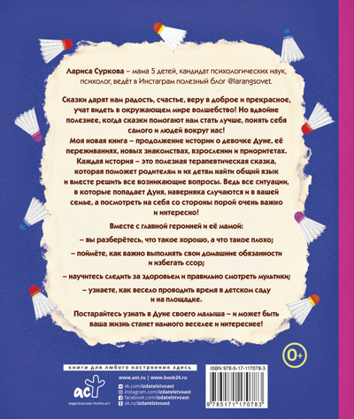 Pasakas sniedz mums prieku, laimi, ticību labām un skaistām lietām, māca saskatīt burvību apkārtējā pasaulē! Taču divtik noderīgi ir tas, ka pasakas palīdz mums kļūt labākiem, izprast sevi un apkārtējos cilvēkus! Mana jaunā grāmata ir turpinājums stāstam par meiteni Dunju, viņas piedzīvoto, jaunām tikšanās reizēm, iepazīšanos, pieaugšanu un prioritātēm. Katrs stāsts ir noderīga terapeitiska pasaka, kas palīdzēs vecākiem un viņu bērniem atrast kopīgu valodu un kopīgi risināt visus radušos jautājumus. Galu galā visas situācijas, kurās nonāk Dunja, iespējams, notiek arī jūsu ģimenē, un paskatīties uz sevi no malas dažkārt ir ļoti svarīgi un interesanti! Kopā ar galveno varoni un viņas mammu: - tu sapratīsi, kas ir labs un kas slikts; - sapratīsi, cik svarīgi ir pildīt mājas pienākumus un izvairīties no strīdiem; - uzzināsi, kā rūpēties par savu veselību un kā pareizi skatīties multfilmas; - iemācīsies, kā jautri pavadīt laiku bērnudārzā un rotaļu laukumā. Pamēģiniet atpazīt savu mazo Doonā - un varbūt jūsu dzīve kļūs daudz jautrāka un interesantāka!