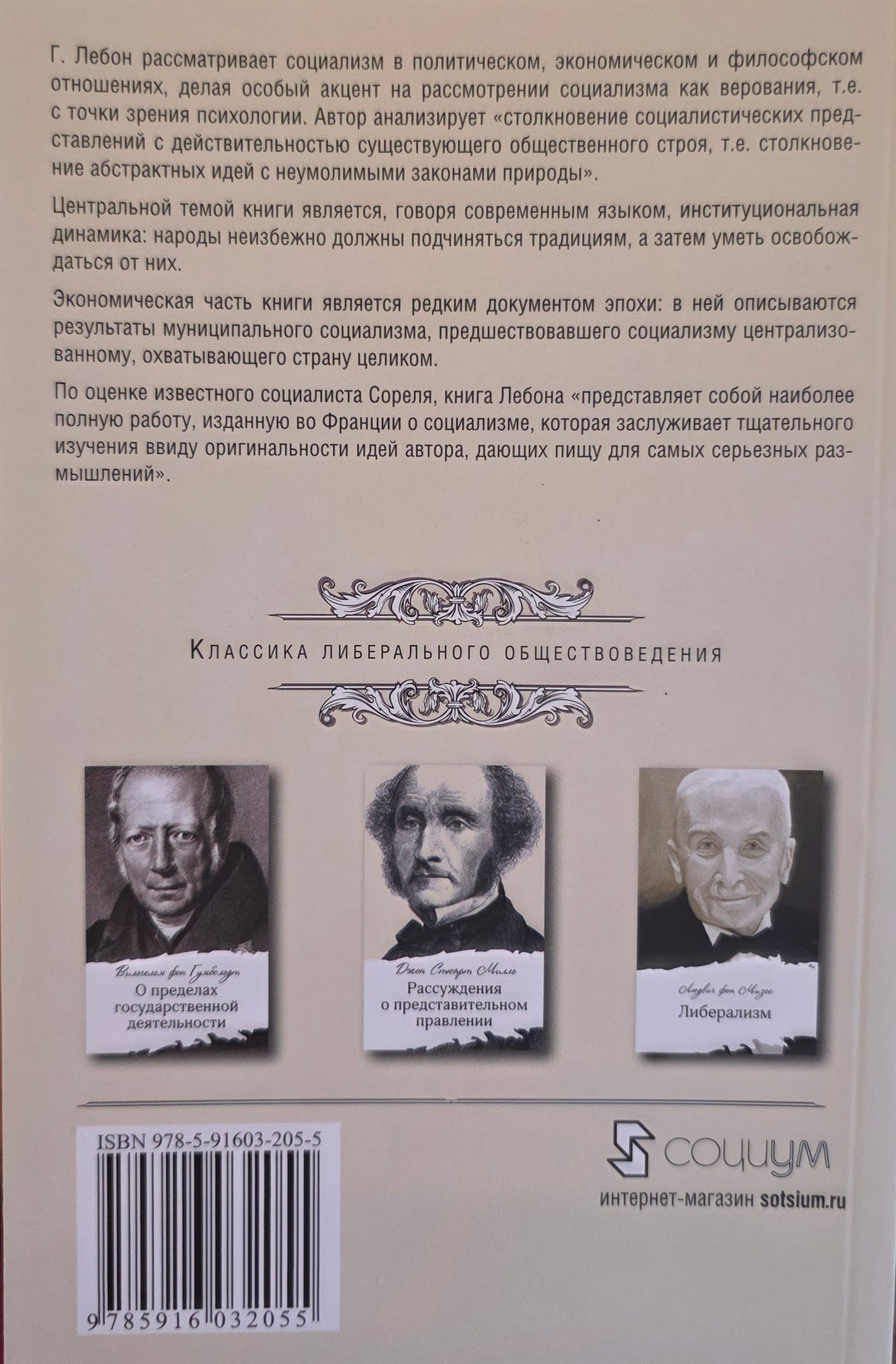 Savā grāmatā "Sociālisma psiholoģija" Ž. Lebons aplūko sociālismu politiskā, ekonomiskā un filozofiskā izteiksmē, īpaši uzsverot sociālisma kā pārliecības aplūkošanu, t.i., no psiholoģijas viedokļa. Autors analizē "sociālistisko ideju sadursmi ar pastāvošās sabiedriskās kārtības realitāti, t.i., abstraktu ideju sadursmi ar nepielūdzamajiem dabas likumiem". Viņaprāt, lai izprastu mūsdienu sociālisma spēku, tas galvenokārt jāuztver kā pārliecība, kas ļauj identificēt spēcīgos psiholoģiskos iemeslus tā pievilcībai.