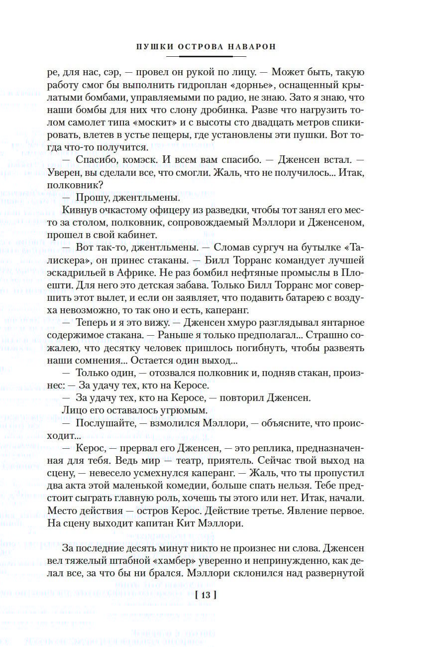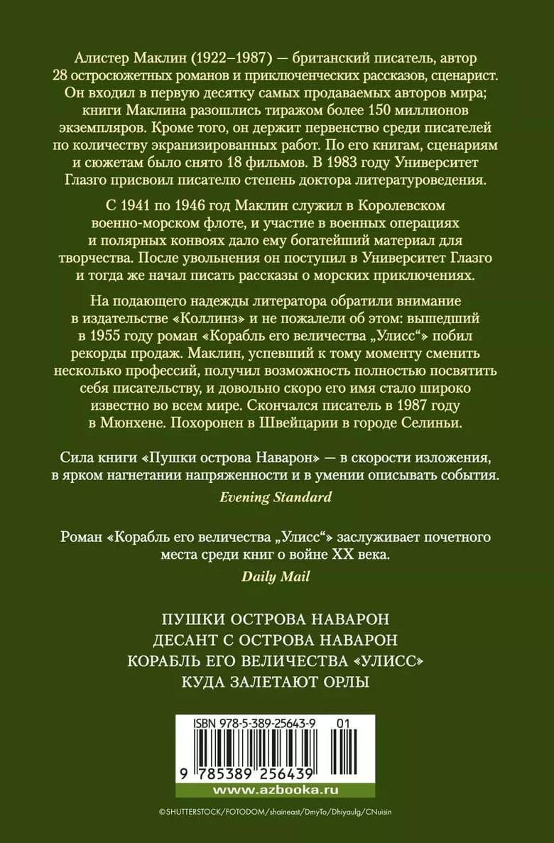 Alistairs Makleins (1922-1987) bija britu rakstnieks, 28 trilleru romānu un piedzīvojumu stāstu autors un scenārists. Viņš bija viens no desmit pārdotāko grāmatu autoriem pasaulē; Makleina grāmatas pārdotas vairāk nekā 150 miljonos eksemplāru, un pēc viņa romāniem, scenārijiem un stāstiem ir uzņemtas 18 filmas. 1983. gadā Glāzgovas Universitāte rakstniekam piešķīra doktora grādu literatūrzinātnē. No 1941. līdz 1946. gadam Maklīns dienēja jūras flotē, piedalījās militārajās operācijās un polārajos konvojos, kas viņam deva bagātīgu materiālu daiļradei un noteica viņa labāko grāmatu tematiku. Šo krājumu, kurā iekļauti četri militāri piedzīvojumu žanra darbi, atklāj slavenais romāns "Navaronas salas lielgabali". Britu komandantu grupai pēc pavēles pēc iespējas īsākā laikā iznīcināt Hitlera krasta bateriju Egejas jūrā ... "Pistoles..." kļuva par bestselleru, un tāda paša nosaukuma ekranizācijas panākumi lika uzrakstīt turpinājumu. "Desants no Navaronas salas" - faktiski pārtaisīts neveiksmīgās filmas scenārijs. Navaronas varoņi saņem jaunu uzdevumu: viņiem ir jāizjauc vācu operācija, lai sakautu partizānus Dienvidslāvijā ... Ceļu uz lielo literatūru pavēra Makleina "Viņa Majestātes kuģis Odisejs" - spoža debija un viens no labākajiem ārzemju darbiem par karu. Romāna sižeta pamatā ir sabiedroto konvoja vēsture, kas sekoja līdz Padomju Savienības ziemeļu ostām. Romānā "Kur lido ērgļi" Otrais pasaules karš tuvojas savam noslēgumam. Nolaupīts ģenerālis, kuram ir slepena informācija par otrās frontes atklāšanu, un, lai viņu glābtu neaizsniedzamajos Alpos, nosūtīta īpaša...