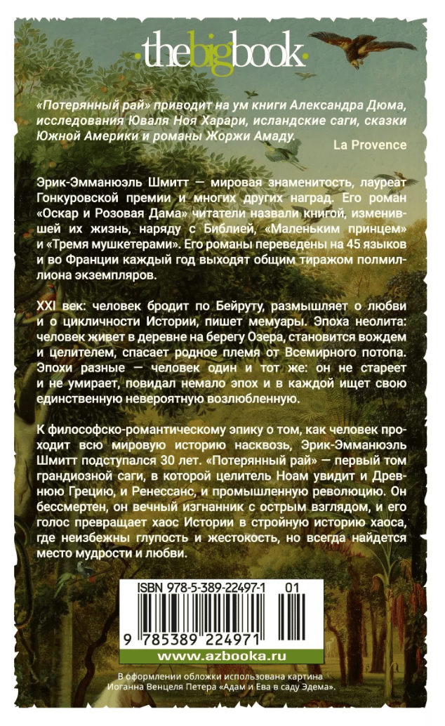 21. gadsimts: vīrietis klejo pa Beirūtu, pārdomā mīlestību un vēstures ciklisko raksturu un raksta memuārus. Neolīta laikmets: vīrietis dzīvo ciematā Sēnas ezera krastā, kļūst par virsaiti un dziednieku un glābj savu cilti no Lielajiem plūdiem. Dažādi laikmeti, bet cilvēks ir viens un tas pats: viņš ne noveco, ne mirst, ir piedzīvojis daudzus laikmetus, un katrā no tiem viņš meklē savu vienīgo, neticamo mīlestību. Ēriks Emanuels Šmits 30 gadus veltīja šī filozofiskā un romantiskā eposa sagatavošanai par to, kā cilvēks pārvietojas visā pasaules vēsturē. "Pazaudētā paradīze" ir grandiozas sāgas pirmais sējums, kurā dziednieks Noams piedzīvos Seno Grieķiju, renesansi un industriālo revolūciju. Viņš ir nemirstīgs, mūžīgs trimdinieks ar asu aci, un viņa balss pārveido vēstures haosu par sakarīgu haosa stāstu, kurā stulbums un nežēlība ir neizbēgami, bet gudrība un mīlestība vienmēr atrod savu vietu.