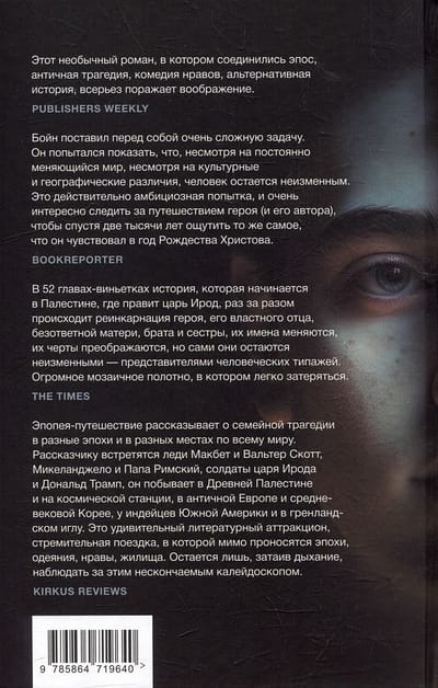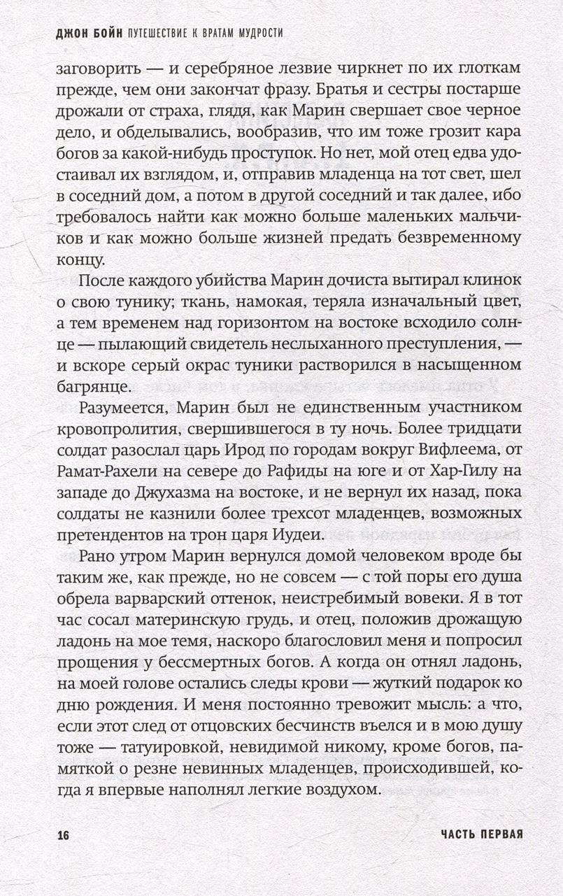Šis stāsts sākas ar ģimeni. Tēvs, māte un divi dēli, viens ar tēva nežēlību un kareivību, otrs ar mātes mākslinieciskumu un maigumu. Viens dēls aizies. Otrs paliks. Pamazām šiem četriem pievienosies arvien vairāk tēlu, kuru rīcība vadīs un noteiks abu brāļu likteņus. Bet tas ir tikai sākums... Abu brāļu un visu ar viņiem saistīto stāsti stiepsies divtūkstoš gadu garumā. Palestīnā, Kristus dzimšanas gadā, sākas grandiozs ceļojums – cauri laikmetiem, valstīm, kultūrām un pat zvaigznēm. Pasaule mainās, ainavas, apģērbs, runas veids mainās, bet cilvēki paliek nemainīgi: viņus joprojām pārņem kaislības, viņi ir pazuduši mīlestībā, apsēsti ar atriebību, vāji, spēcīgi, muļķīgi, cēli, nežēlīgi, līdzjūtīgi... "Pasaule, kas mūs ieskauj, var mainīties, bet mūsu jūtas paliek nemainīgas," saka Boina varonis, cenšoties atrast ceļu uz vārtiem, aiz kuriem mirdz cilvēkam nepieejama gudrība. Džona Boina jaunais romāns ir episka līdzība, kas stāsta par cilvēci un katru no mums. Oriģināla, unikāla, dramatiska un ironiska grāmata par cilvēka dabu.