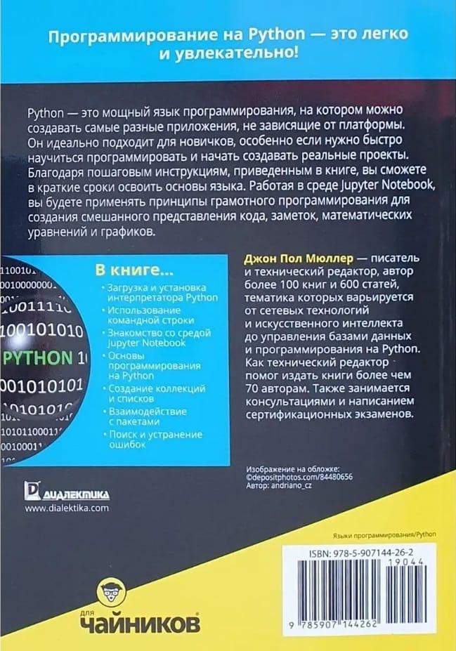 Python ir jaudīga programmēšanas valoda, ko var izmantot, lai radītu dažādas no platformas neatkarīgas lietojumprogrammas. Tā ir ideāli piemērota iesācējiem, īpaši, ja nepieciešams ātri apgūt programmēšanu un sākt veidot reālus projektus. Pateicoties šajā grāmatā sniegtajiem soli pa solim izklāstītajiem norādījumiem, jūs ātri apgūsiet valodas pamatus. Strādājot Jupyter Notebook vidē, jūs pielietosiet lietpratīgas programmēšanas principus, lai izveidotu jauktu koda, piezīmju, matemātisko vienādojumu un grafiku attēlojumu. Grāmatā: Python lejupielādēšana un instalēšana. Komandrindas izmantošana. Iepazīšanās ar Jupyter Notebook vidi. Python programmēšanas pamati. Kolekciju un sarakstu veidošana. Saskarsme ar pakotnēm. Kļūdu atrašana un labošana. Džons Pols Mellers ir rakstnieks un tehniskais redaktors, kurš ir autors vairāk nekā 100 grāmatām un 600 rakstiem par dažādām tēmām, sākot no tīklu un mākslīgā intelekta līdz datubāzu pārvaldībai un Python programmēšanai. Kā tehniskais redaktors viņš ir palīdzējis vairāk nekā 70 autoriem publicēt grāmatas. Viņš nodarbojas arī ar konsultēšanu un sertifikācijas eksāmenu rakstīšanu.