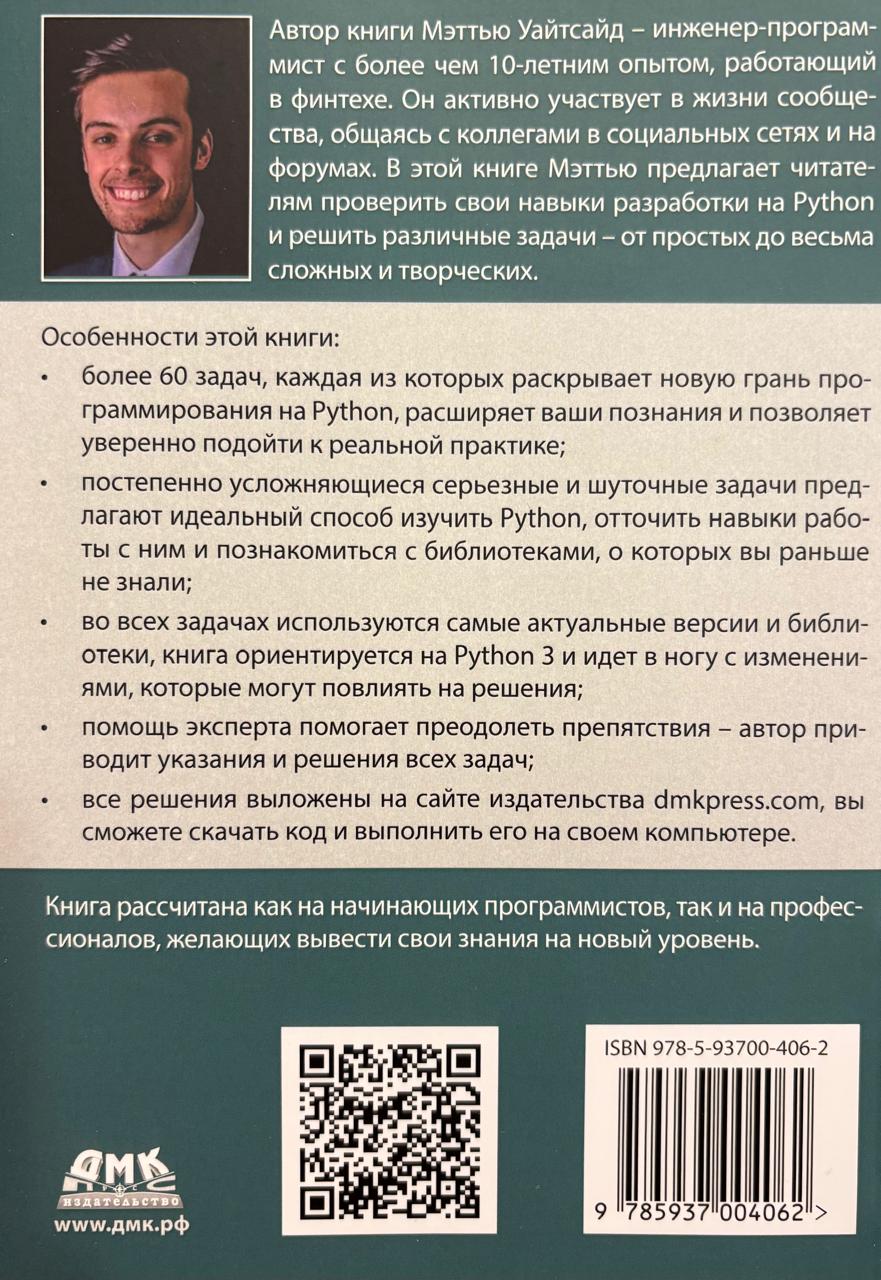 Grāmatas autors Metjū Vaitsaids ir programmatūras inženieris ar vairāk nekā 10 gadu pieredzi finanšu tehnoloģiju jomā. Viņš aktīvi piedalās kopienas dzīvē, sazinoties ar kolēģiem sociālajos medijos un forumos. Šajā grāmatā Metjū izaicina lasītājus pārbaudīt savas Python izstrādes prasmes un risināt dažādas problēmas, sākot no vienkāršām līdz ļoti sarežģītām un radošām.