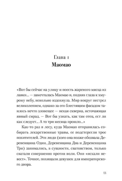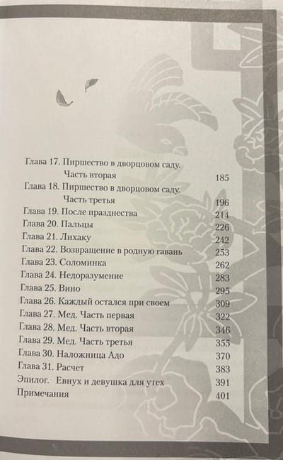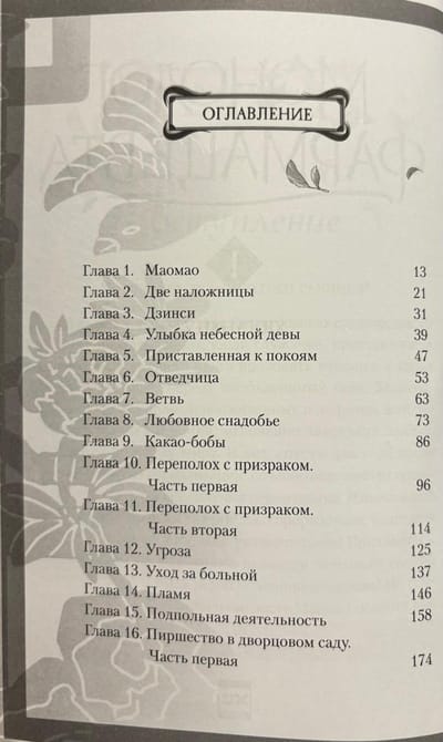 Grāmata atbilst 1 oficiālā japāņu izdevuma sējumam, 31 nodaļa + epilogs un piezīmes: "Maomao", "Divas konkubīnes", "Džinši", "Debesu jaunavas smaids", "Norīkots palātām", "Tiesu izpildītājs", "Zars", "Mīlas dzēriens", "Kakao pupiņas", "Nepatikšanas ar spoku" (1-2), "Draudi", "Rūpes par slimniekiem", "Liesma", "Pagrīdes aktivitātes", "Svētki pils dārzā" (1-3), "Pēc svētkiem", "Pirksti", "Lihaku", "Atgriešanās dzimtajā ostā", "Salmiņš", "Nepareiza izpratne", "Vīns", "Katrs palika pie sava", "Medus" (1-3), "Konkubīnes kņada", "Aprēķins", "Epilogs. Einuhs un mierinājuma meitene".