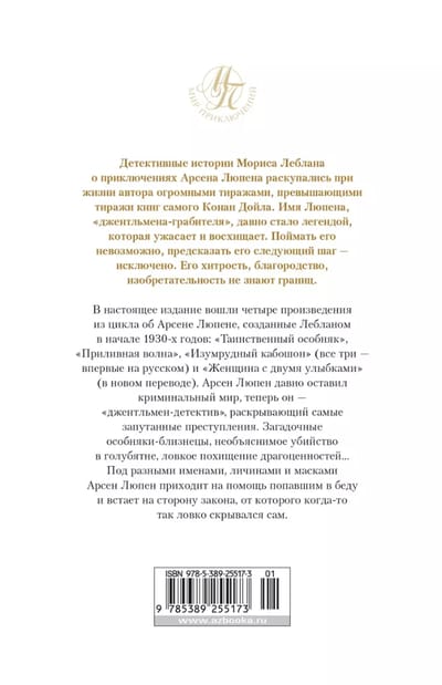 Morisa Leblāna detektīvstāsti par Arsēna Lupina piedzīvojumiem autora dzīves laikā tika pārdoti milzīgās tirāžās, pārsniedzot paša Konana Doila grāmatu tirāžu. Laupītāja džentlmeņa Lupīnas vārds jau sen ir leģenda, kas šausmino un iepriecina. Viņu nav iespējams noķert, nav iespējams paredzēt viņa nākamo gājienu. Viņa viltībai, cēlumam un atjautībai nav robežu. Šajā izdevumā ir iekļauti četri darbi no Arsēna Lupīnas sērijas, ko Leblāns radīja 1930. gadu sākumā: “Noslēpumainā savrupmāja”, “Paisuma vilnis”, “Smaragds Kabošona” un “Sieviete ar diviem smaidiem”. Arsēns Lupins jau sen pameta noziedzīgo pasauli, tagad viņš ir “džentlmeņu detektīvs”, kas atrisina vissarežģītākos noziegumus. Noslēpumainas dvīņu savrupmājas, neizskaidrojama slepkavība baložu novietnē, gudra juvelierizstrādājumu zādzība... Arsēns Lupīns ar dažādiem nosaukumiem, maskām un maskām nāk palīgā nelaimē nonākušajiem un nostājas likuma pusē, no kuras reiz viņš pats tik gudri paslēpies.