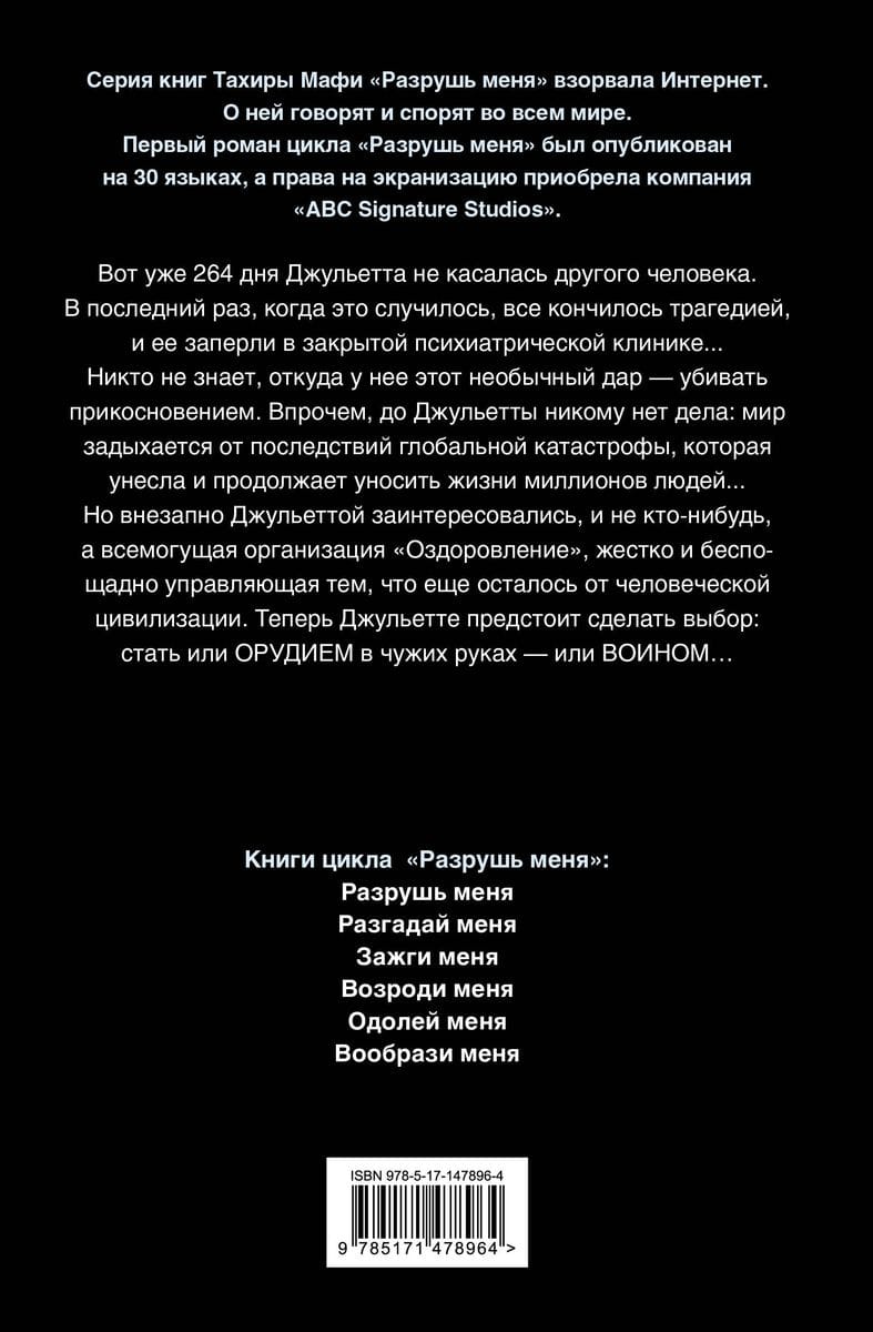 264 dienas Džuljeta nav pieskārusies nevienam cilvēkam. Pēdējo reizi tas beidzās traģiski, un viņu ieslodzīja slēgtā psihiatriskajā klīnikā... Neviens nezina, kur viņa ieguva šo neparasto dāvanu - nogalināt ar pieskārienu. Tomēr nevienu neinteresē Džuljeta: pasaule dus no globālās katastrofas sekām, kas ir paņēmusi un turpina laupīt dzīvības miljoniem cilvēku..... Taču pēkšņi par Džuljetu sāk interesēties ne jebkurš cits, bet gan visvarenā organizācija "Rekuperācija", kas nežēlīgi un skarbi kontrolē to, kas vēl palicis pāri no cilvēces civilizācijas. Tagad Džuljetai ir jāizvēlas: vai nu kļūt par instrumentu citu rokās - vai arī par karotāju.....