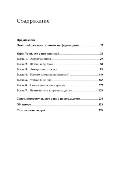 Izmantojot simtiem piemēru (no b2c un b2b tirgus prakses), autors analizē septiņas spēcīgākās emocionālās atsperes, kas mudina cilvēkus rīkoties. Tās ir skaudība, ziņkārība, bailes, mīlestība, alkatība, iedomība, iedomība un vainas apziņa.