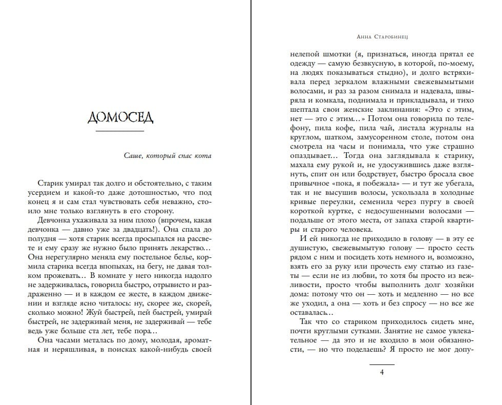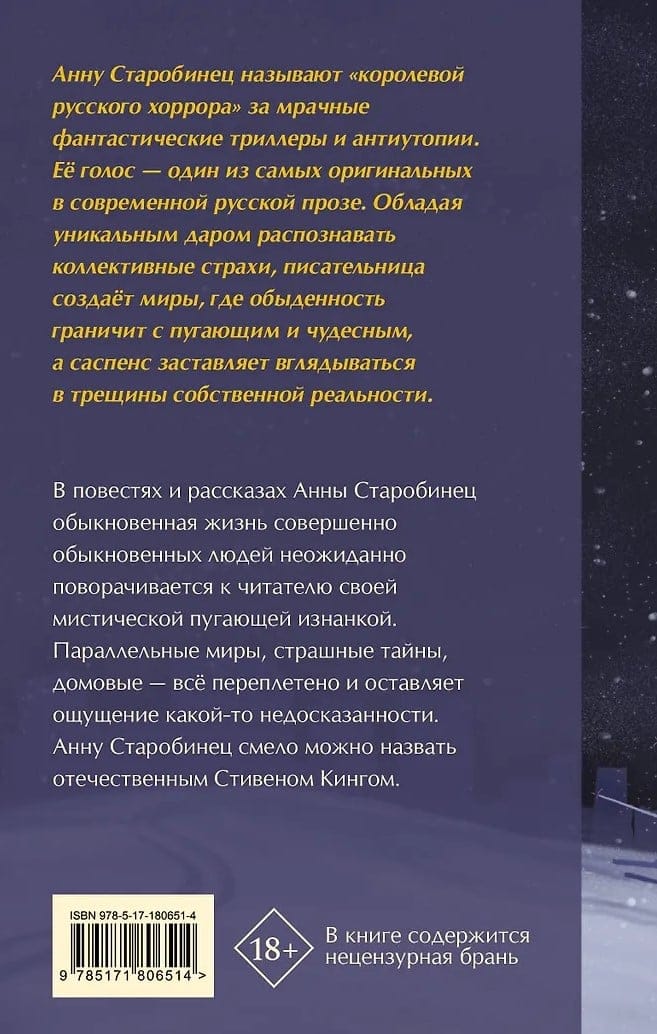 Annas Starobinecas stāstos pilnīgi parastu cilvēku ikdienas dzīve negaidīti atklāj mistisku, šausminošu slēptuvi. Paralēlās pasaules, šausminoši noslēpumi un mājas gari — viss ir savstarpēji saistīts, radot sajūtu, ka kaut kas netiek izteikts. Annu Starobinecu varētu viegli saukt par Krievijas Stefanu Kingu.