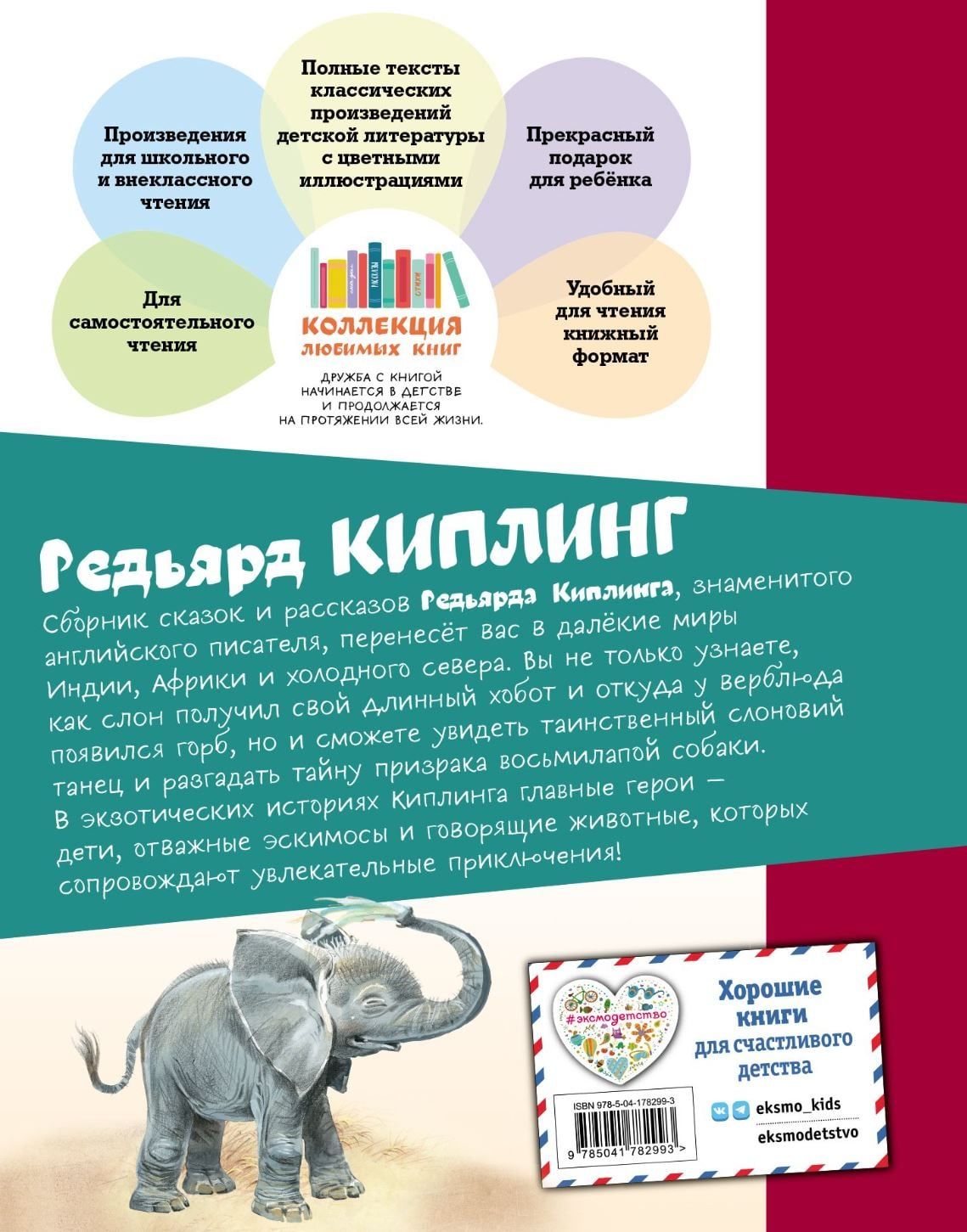 Nav labāka veida, kā iepazīstināt bērnu ar aizraujošiem stāstiem, kā iegremdēt viņu brīnišķīgā un krāsainā pasaulē. Pateicoties Rūdjarda Kiplinga pasakām un stāstiem, jūs uzzināsiet, kā zilonis ieguva tik garu stumbru, kā kamielis ieguva kupru, par ko runā dzīvnieki, kad viņi ir vieni, vai senās leģendas var būt patiesas un daudz ko citu. Īpaša, neatkārtojama atmosfēra lasīšanas laikā radīs spilgtas Indijas un Āfrikas valstu krāsas.