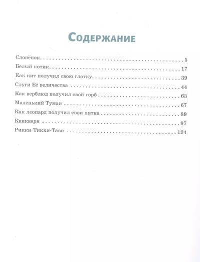 Šajā krājumā iekļautas gan labi zināmas pasakas: "Rikki-Tikki-Tavi", "Zilonis", "Kā vaļs dabūja rīkli", "Kā kamielim radās kupris", "Kā leopardam radās plankumi", gan reti publicēti stāsti no "Džungļu grāmatas": "Baltais ronis", "Viņas Majestātes kalpi", "Mazais Tumai" un "Ātrumperns".