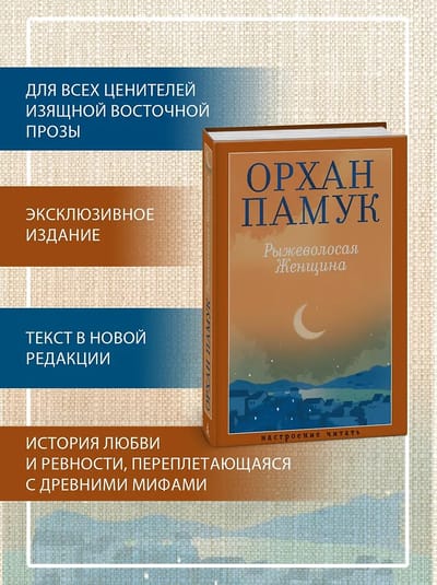 Savā elegantajā romānā "Sarkanmatainā sieviete" Orhans Pamuks stāsta par jaunas Stambulas vidusskolnieces un ceļojošas teātra aktrises mīlasstāstu, kura katru vakaru nelielai auditorijai stāsta senus pasakas un leģendas. Pirmo reizi izjutis kaisles, greizsirdības, brīvības un atbildības sajūtas reibumu, Džems Čeliks šīs sajūtas nesīs līdzi visu savu dzīvi, lai tikai pēc trīsdesmit gadiem atkal aci pret aci satiktos ar savu pagātni...