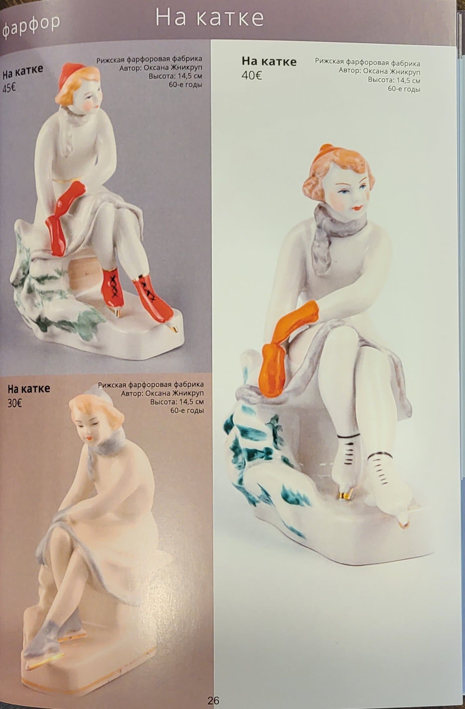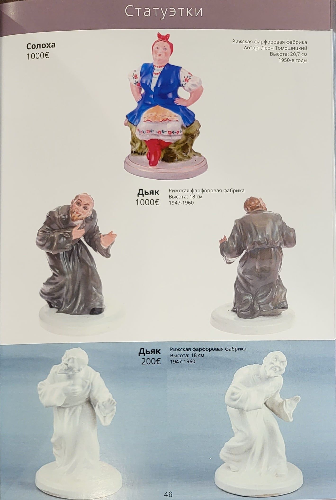 Mīļie kungi! Katalogs, ko Jūs tagad redzat, ir pirmā un nelielā daļa no Rīgas Porcelāna fabrikas produkcijas demonstrācijas. Nākotnē mēs turpināsim aptvert arī citus šajā rūpnīcā ražotos priekšmetus. Šī kataloga galvenais mērķis bez daudzu māksliniecisko miniatūru skaistuma un pieprasījuma ir parādīt to reālo cenu. Un šī cena neparādījās nejauši. Norādītā cena pie katras statuetes ir summa, par kādu šīs statuetes tika pārdotas mūsu izsolē, kuru esam rīkojuši jau vairāk nekā 30!!!!!. Tāpēc ikviens, kurš aplūkos katalogu, varēs noteikt, kāda ir aptuvena viņam piederošā retuma vērtība vai par kādu cenu var iegādāties līdzīgu statueti. Cena, protams, - tirgus un ir atkarīga no daudziem faktoriem. Pirmām kārtām tā ir mākslinieciskā vērtība, autora vārds, līdz mūsdienām saglabājušos šīs emisijas statuešu skaits, to stāvoklis un virkne citu faktoru. No otras puses, cena ne pēdējā vietā spēlē un cilvēku skaits, kuri vēlas iegādāties šo konkrēto, konkrēto statueti, viņu vēlme to iegūt, kā arī tās personas finansiālais stāvoklis, kura vēlas iegādāties pārdodamo priekšmetu. Ņemot vērā, ka mūsu izsolē par antikvārajiem priekšmetiem var cīnīties cilvēki no vairāk nekā 50 pasaules valstīm, statuju cena kļūst vēl prognozējamāka. Gadās arī otrādi: dažas porcelāna figūriņas, piemēram, tauriņi, kurus daži kolekcionāri kolekcionē īpaši, izaug līdz debesīm, ja saduras vairāku šo miniatūru cienītāju intereses. Jebkurā gadījumā, uzzinot reālās izsoļu cenas, jūs labāk orientēsieties, pērkot vai pārdodot līdzīgas figūriņas.