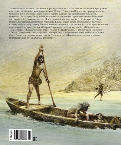 Aizraujošais stāsts par drosmīgu jūrnieku ir aizrāvis lasītājus paaudzēm ilgi, rosinot iztēli un iedvesmojot jaunos romantiķus. Robinsons Krūzo ir drosmīga, izturīga vīrieša paraugs, kurš spēj ar godu izturēt visus pārbaudījumus un grūtības, kuram izdevās saglabāt ticību sev un nekrist izmisumā, saskaroties ar spēcīgiem elementiem. Slavenais Austrālijas mākslinieks un Hansa Kristiana Andersena balvas laureāts Roberts Ingpens, iedvesmojoties no Robinsona Krūzo stāsta, radīja virkni lielisku ilustrāciju šim slavenajam romānam. Ingpens ir ilustrējis arī tādus klasiskus darbus kā "Dārgumu sala", "Džungļu grāmata", "Toma Sojera piedzīvojumi", "Ziemassvētku eglīte", "Alise Brīnumzemē", "Pinokio piedzīvojumi", "Pīters Pens un Vendija", "Riekstkodis", "Vējš vītolos", "Brīnumainais Oza zemes burvis" un "Apkārt pasaulei astoņdesmit dienās". Izdevniecība "Makhaon" ar lepnumu piedāvā šīs brīnišķīgās grāmatas.