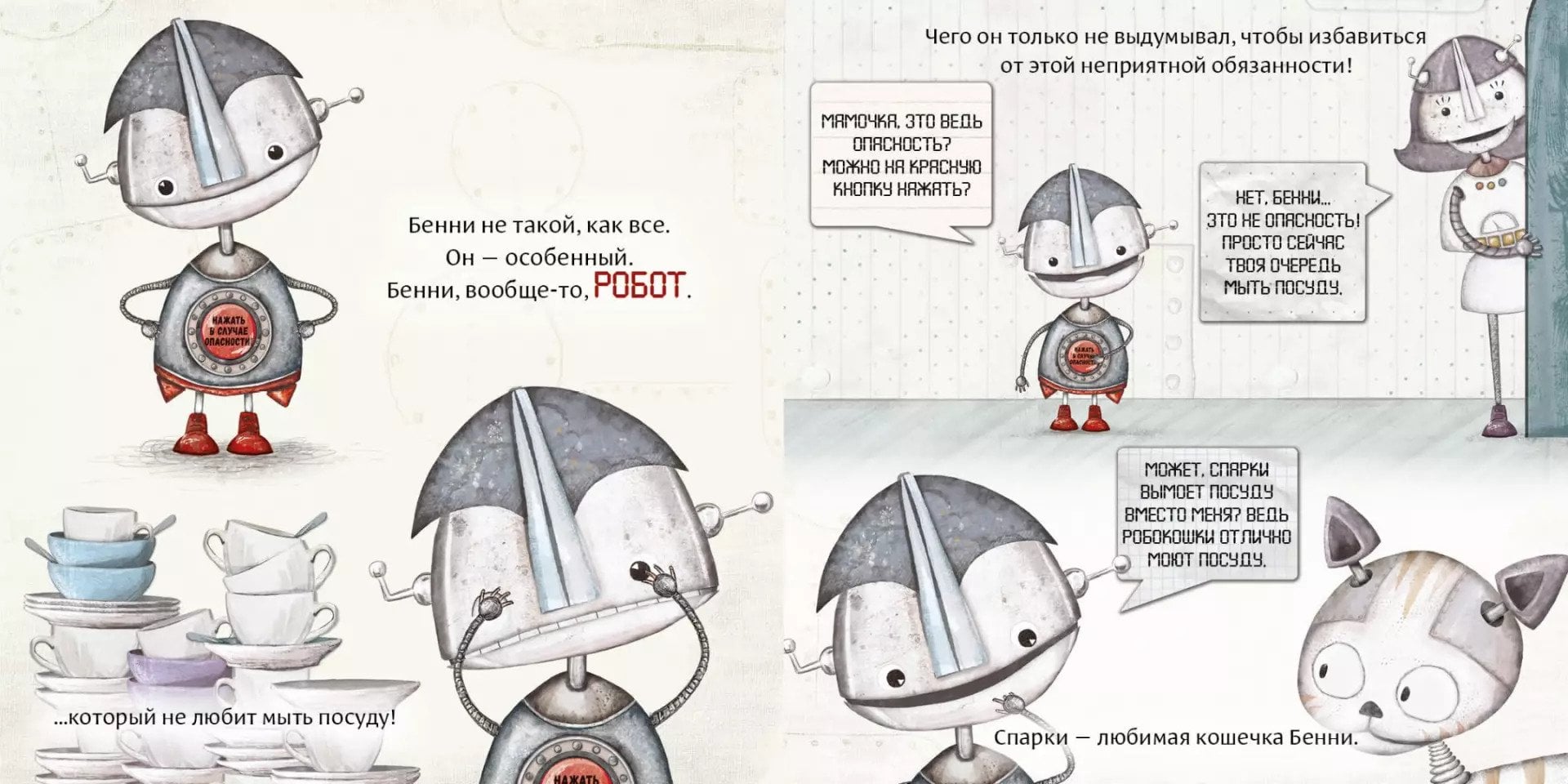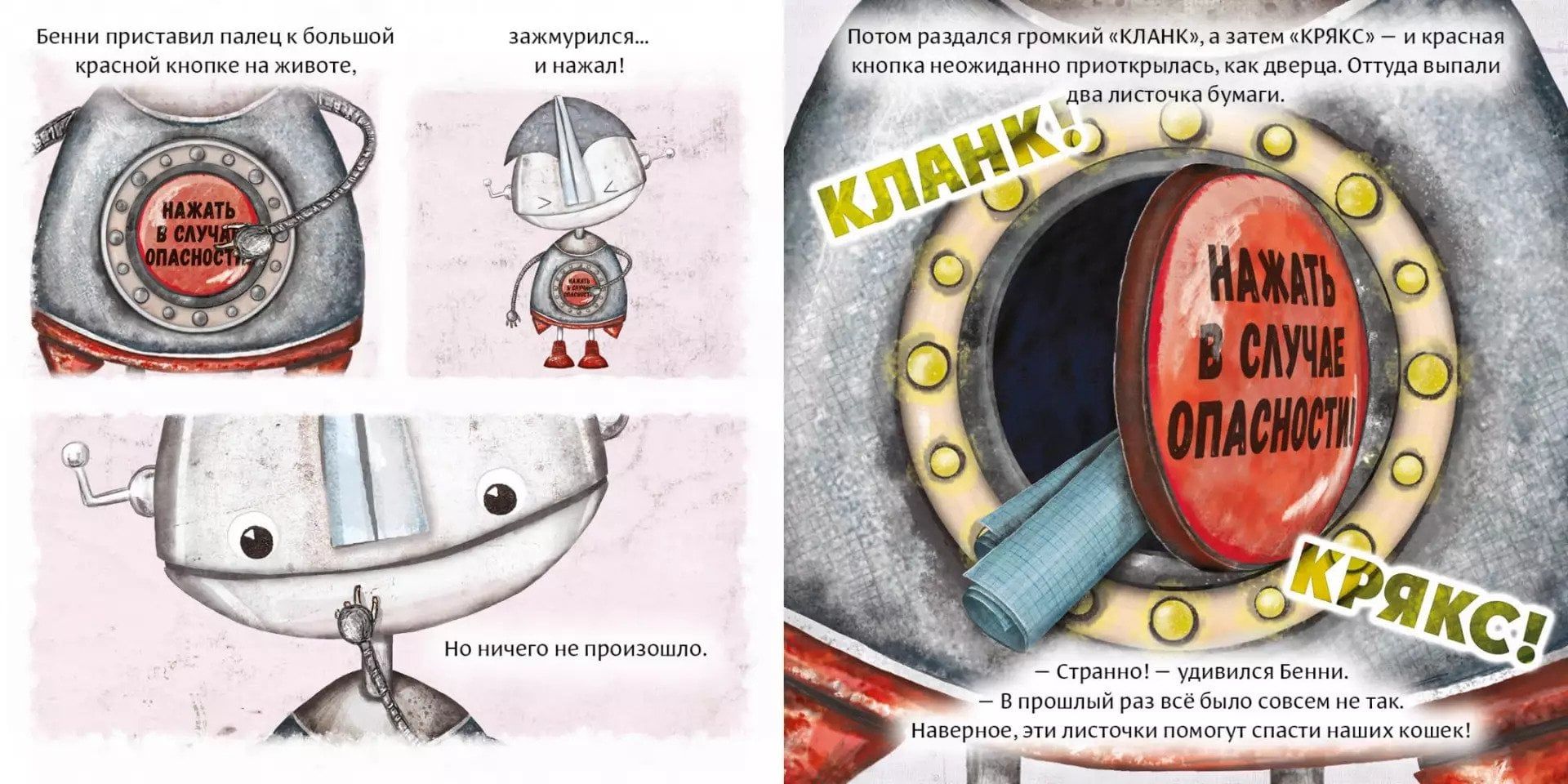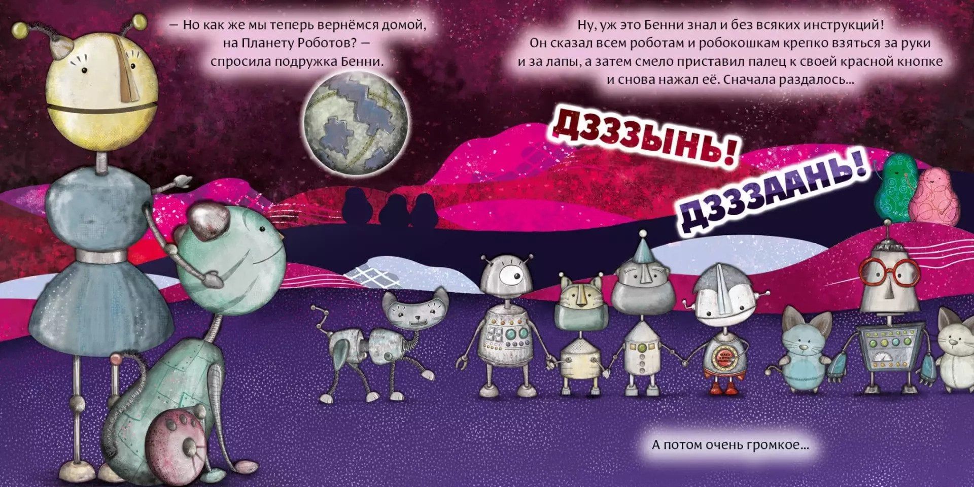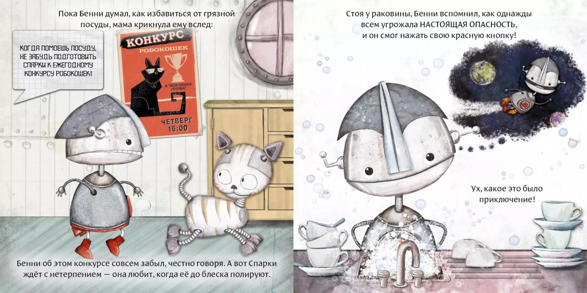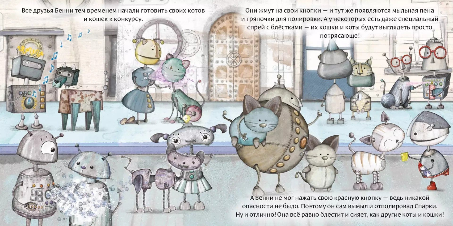 Benijs ir mazs robots. Viņš dzīvo Robotu planētā kopā ar mammu un savu mīļāko robotu kaķi Sparkiju. Viņam uz vēdera ir viena liela sarkana poga, ko var nospiest tikai īstas BĒDA gadījumā. Kādu rītu visi kaķi un kaķēni pazūd bez pēdām. Kā gan glābt savus mīļākos mājdzīvniekus? Un kam robotu draugiem būs nepieciešams Lielākais dzelzs kaķis? Un vai Benijs beidzot spēs nospiest savu sarkano pogu...?