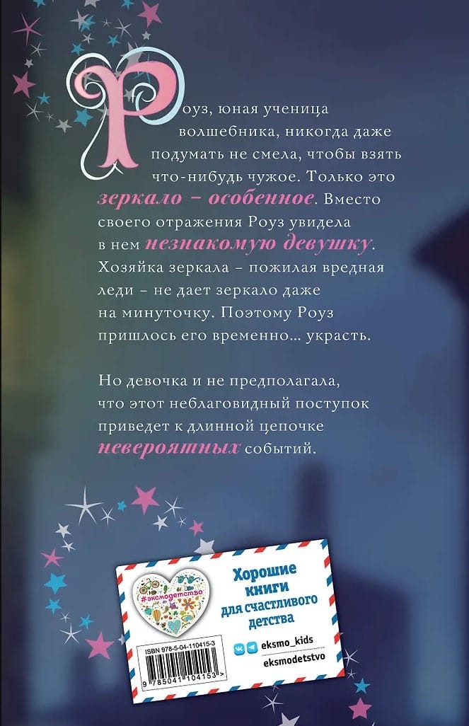 Rouza, jauna burvja mācekle, nekad pat neuzdrošinājās domāt par to, lai paņemtu kaut ko, kas viņai nepiederētu. Taču šis spogulis bija īpašs. Sava atspulga vietā Rouza ieraudzīja dīvainu meiteni. Spoguļa īpašniece — ļauna, vecāka gadagājuma kundze — ne uz mirkli nevēlējās viņai aizdot spoguli. Tāpēc Rouza bija spiesta uz laiku... to nozagt. Taču meitenei nebija ne jausmas, ka šī nepiedienīgā rīcība novedīs pie garas neticamu notikumu ķēdes.