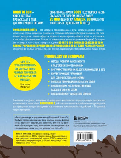 “Born to Run” ir stāsts par pārmaiņām, cilvēka, kurš ir piedzīvojis sakāves rūgtumu, ceļojumu, cerības stāsts un sava neierobežotā spēka apzināšanos. Šis spēks mudina jūs iziet no savas komforta zonas un izpētīt pasauli caur skriešanu, kad vien vēlaties un jebkuros apstākļos. Vai esat gatavi pieņemt izaicinājumu un kļūt par neapturamu skrējēju? No bestselleru autoriem un slavenā treneru dueta “Born to Run” nāk pilnībā ilustrēta, praktiska skriešanas rokasgrāmata visiem līmeņiem — no iesācējiem līdz pieredzējušiem skrējējiem — par to, kā ēst, sacensties un trenēties kā labākajiem pasaulē.