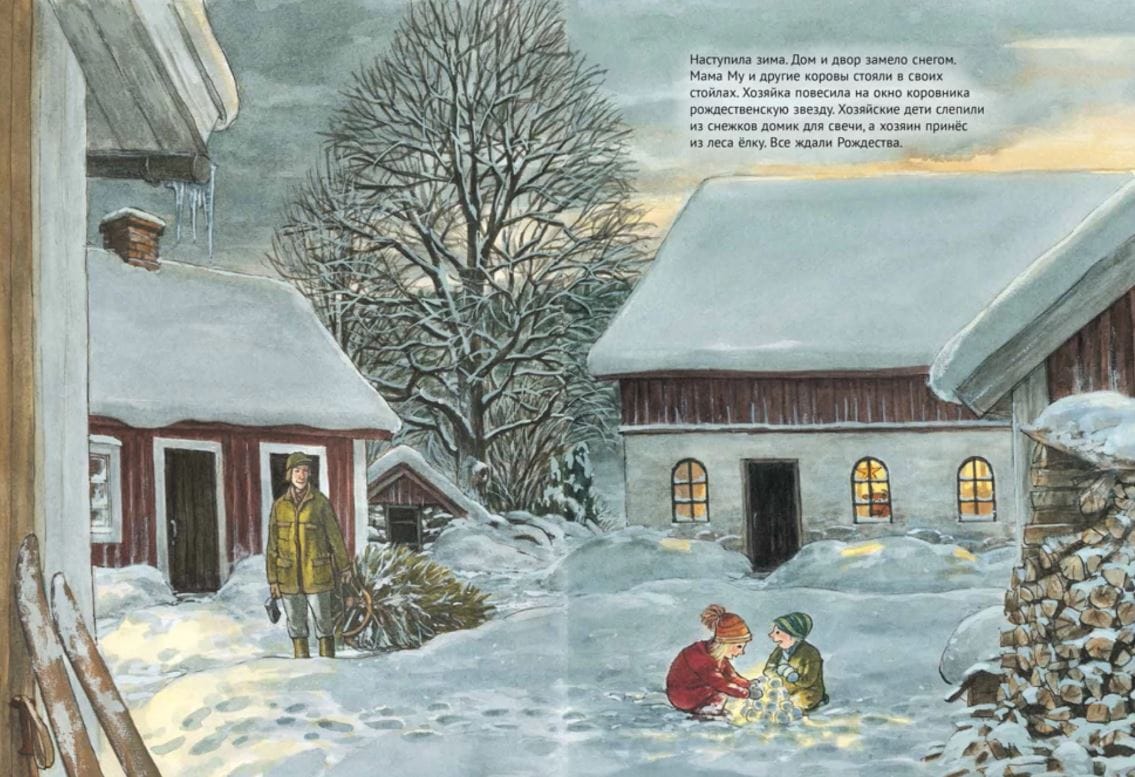 "Kādi Ziemassvētki ir Ziemassvētki bez dāvanām?" Krakss nodomāja un sarūpēja sev veselu kalnu pārsteigumu. Bet kāda gan ir prieka no dāvanām, ja tās dāvini pats sev?! Īsti svētki ir tad, kad apkārt ir draugi. Juja Vīslandere ir slavena zviedru bērnu grāmatu autore, kuras slavenākais darbs ir stāstu sērija par zinātkāro govi Māmuļu Mū un filozofējošo vārnu Kraksu. Juja šos stāstus ir izdomājusi kopā ar savu vīru Tomasu. Ir pagājuši jau 20 gadi, Tomasa vairs nav dzīvs, bet Mama Moo popularitāte arvien pieaug. Tagad ir izdotas 8 krāsainas grāmatas ar mūsu iemīļotā Svena Nordkvista ilustrācijām, ir tapušas multfilmas, radio lugas un daudzas izrādes. Daudzas sērijas grāmatas Krievijā izdotas pirmo reizi. Pārpublicējumi izdoti jaunā tulkojumā, grāmatu formāts ir tuvs oriģinālam (tāds pats kā sērijā par Petsonu un Findusu). Sērija regulāri tiek papildināta ar jaunām grāmatām. Krievu valodā ir tulkotas datorspēles par Māmiņu Mū un Kraksu, kā arī ir tapusi teātra izrāde un pilnmetrāžas multfilma krievu valodā.