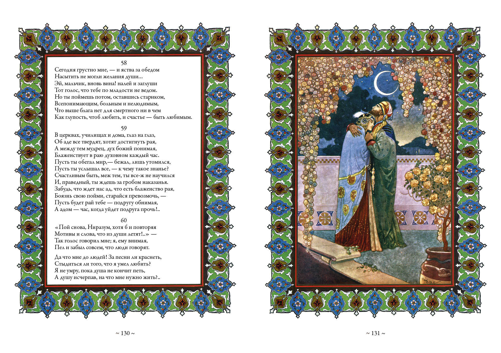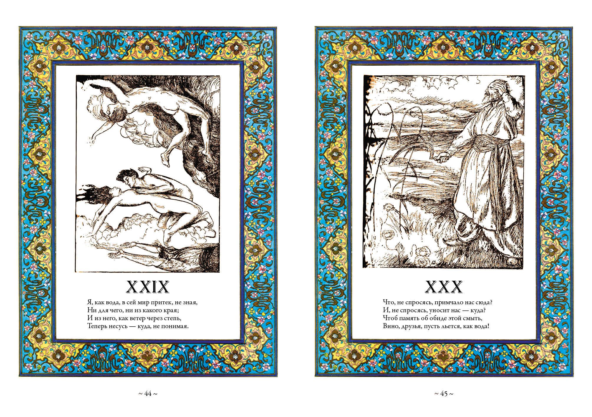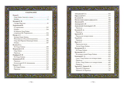 Šajā krājumā apkopoti divdesmit četru krievu autoru 19. gadsimta beigās un 20. gadsimta sākumā veiktie Omāra Hajama dzejas tulkojumi. Daudzi no šiem tulkojumiem pēc revolūcijas netika publicēti. Par katru tulkotāju ir sniegta īsa vēsturiska piezīme. Krājumu rotā britu grafiķu E. Sullivana, R. Bulla, E. Dulaka, G. Rosa, V. Pogani un irāņu miniatūrista Huseina Behzada darbi.