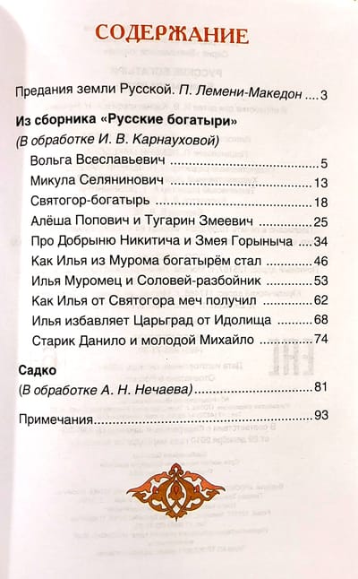 Bailini ir tautas pasakas par senās Krievijas varoņu krāšņajiem varoņiem. Kolekcijā iekļauti eposi par Volgu Vseslaviču, Mikulu Seljaņinoviču, Svjatogatīru, Alešu Popoviču, Dobrinu Ņikitihu, Iļju Murometu, Sadko u.c. slaveno krievu folkloristu I. V. Karnauhova un A. N. Ņečajeva atklāšanā.