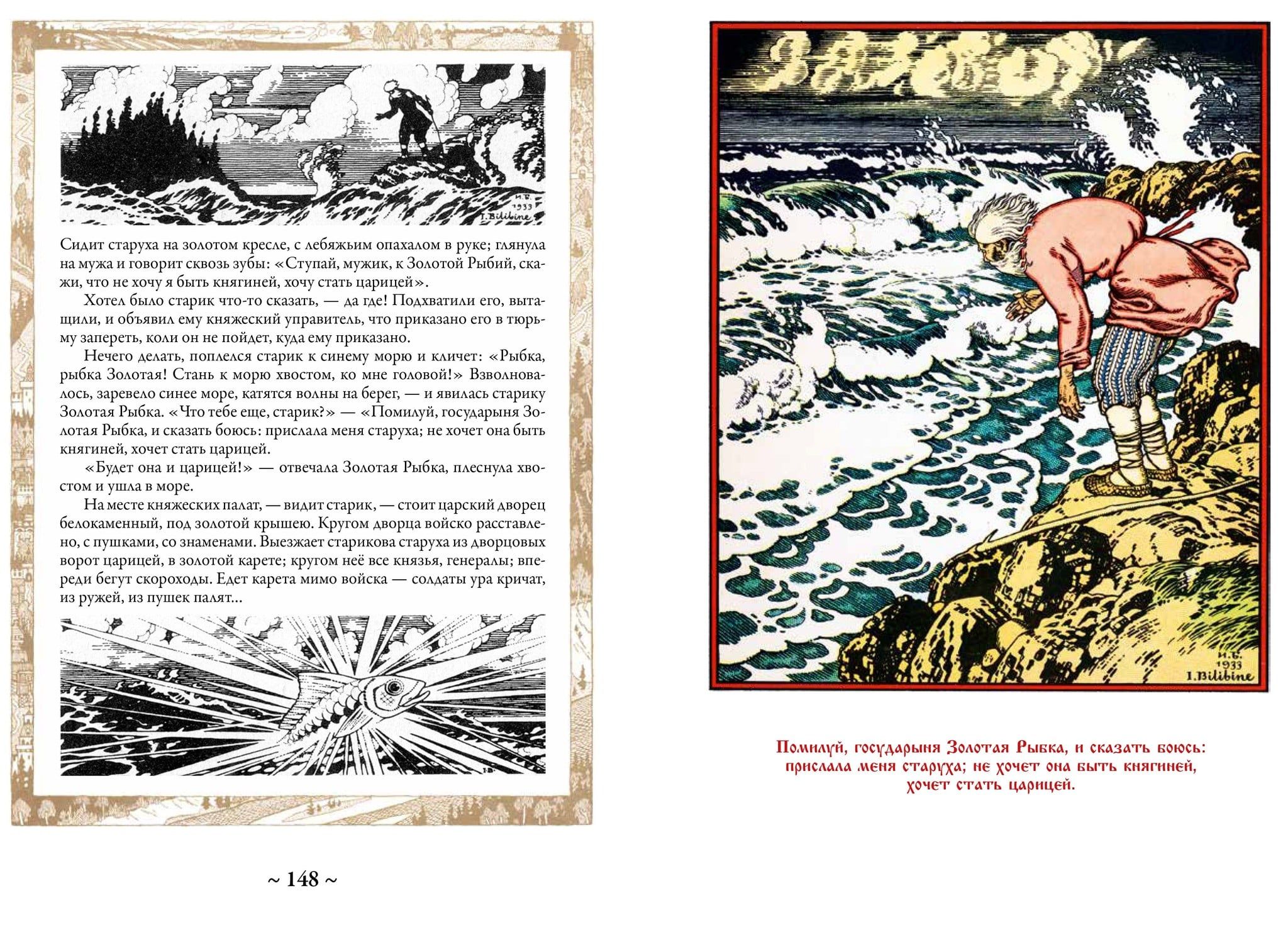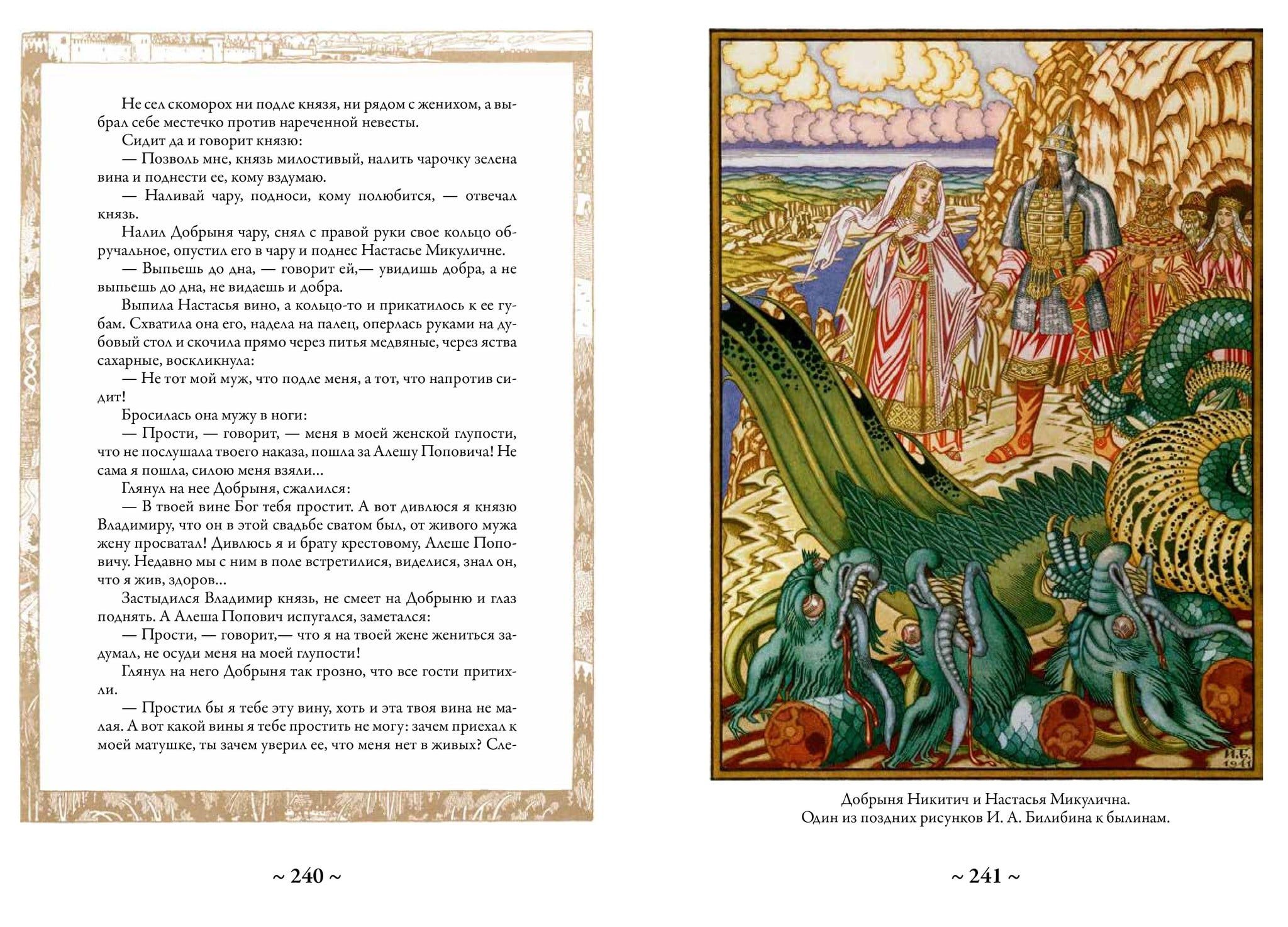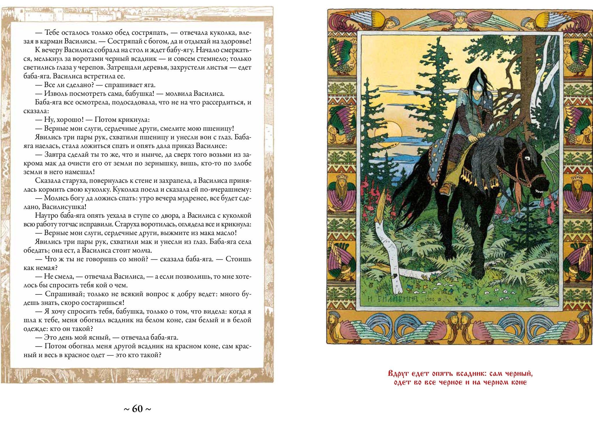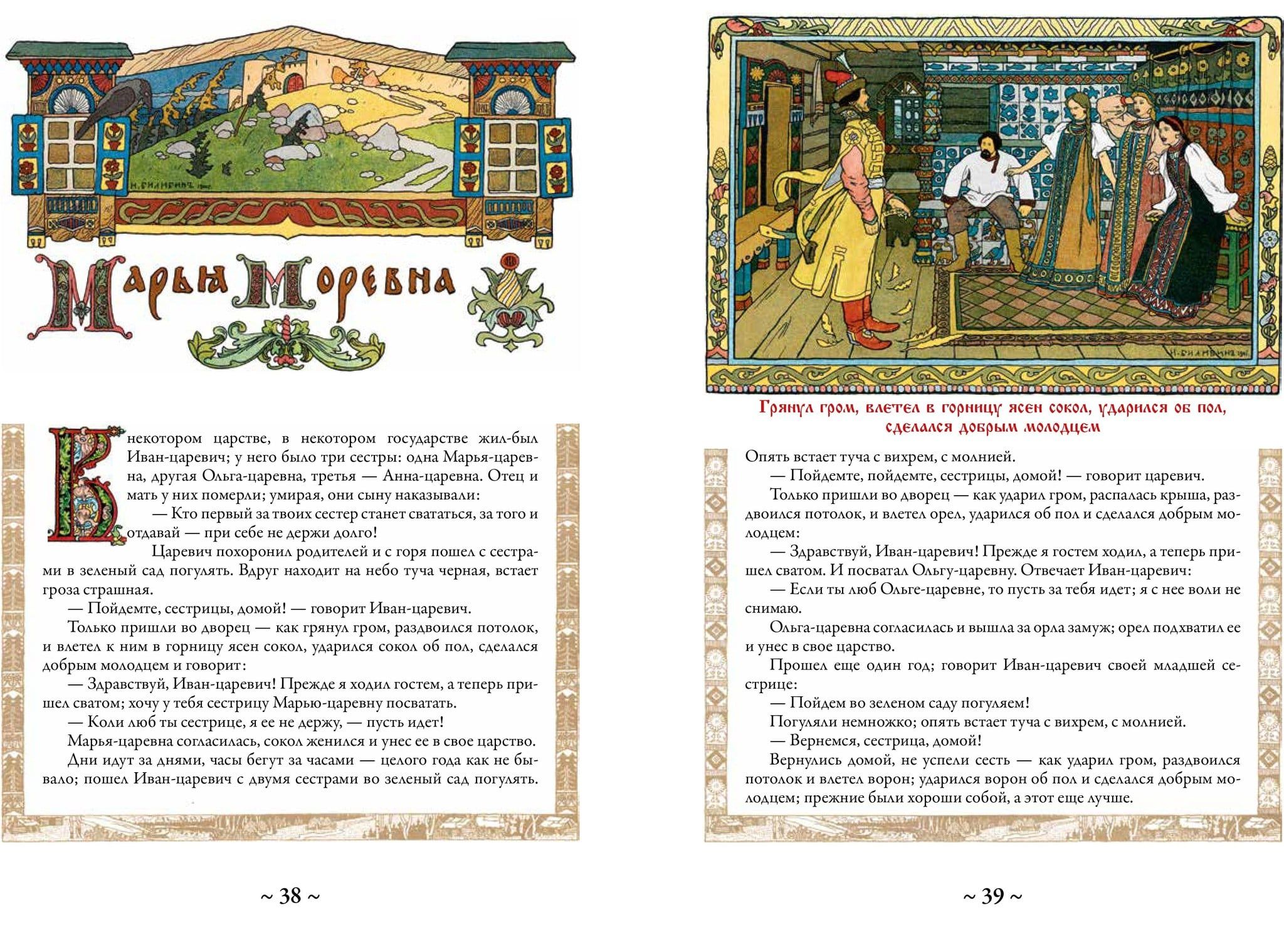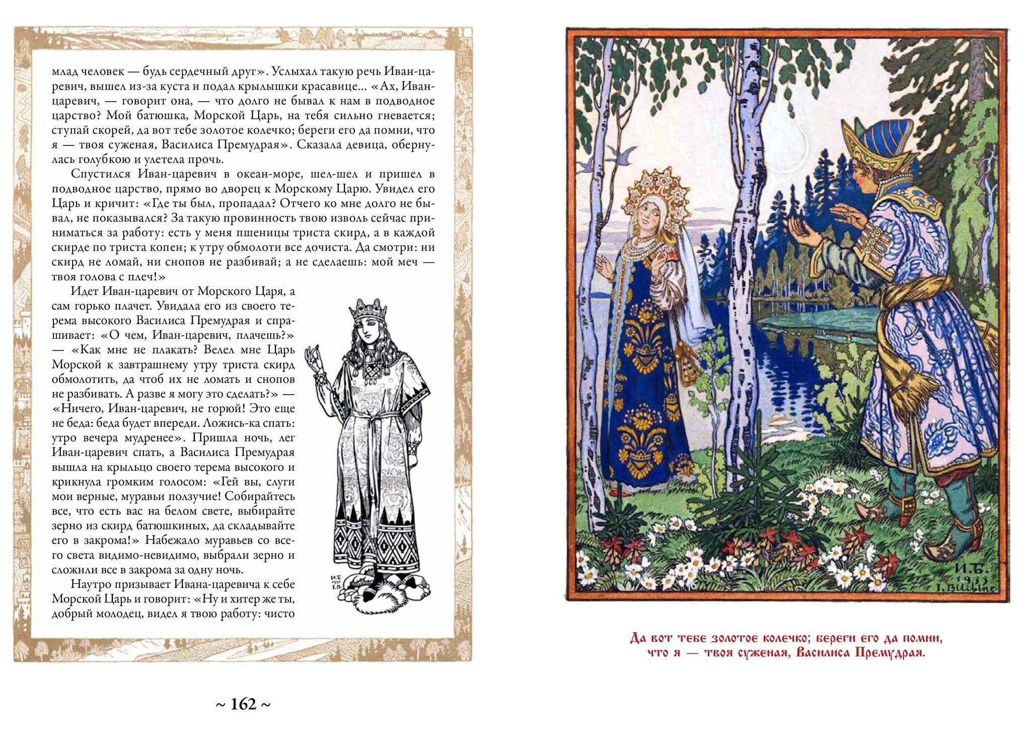 Krievu pasakas un pasakas ir nemainīgs un dziļš pamats, uz kura bērnībā tika audzinātas un vēl ilgi tiks audzinātas veselas mūsu tautiešu paaudzes. Krājumā, ko turat rokās, ir iekļautas septiņpadsmit klasiskās krievu pasakas un sešas bilžu pasakas. Starp tām ir stāsti par Ivanu Careviču, Varžu princesi, Pelēko vilku, Vasilisu Skaistuli, Iļju Muromecu un daudziem citiem labi pazīstamiem varoņiem. Tie gandrīz vienmēr ir iekļauti jebkurā krievu pasaku krājumā. Šī izdevuma īpatnība ir atšķirīga. Visas ilustrācijas tajā ir veidojis tāds atzīts ornamenta un zīmējuma virtuozs, brīnišķīgs krāsu meistars, lielisks ilustrators un grāmatu mākslinieks kā Ivans Jakovļevičs Bilibins. Tās piešķir šai grāmatai neatkārtojamu garšu, jo nebūs pārspīlēti teikt, ka krievu pasaku brīnišķīgā pasaule un tās varoņi lielā mērā ir iztēlojušies, pateicoties šī talantīgā mākslinieka unikālajiem zīmējumiem.