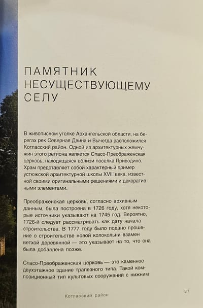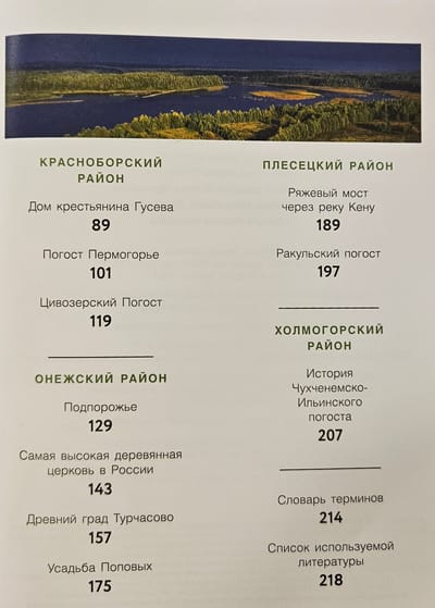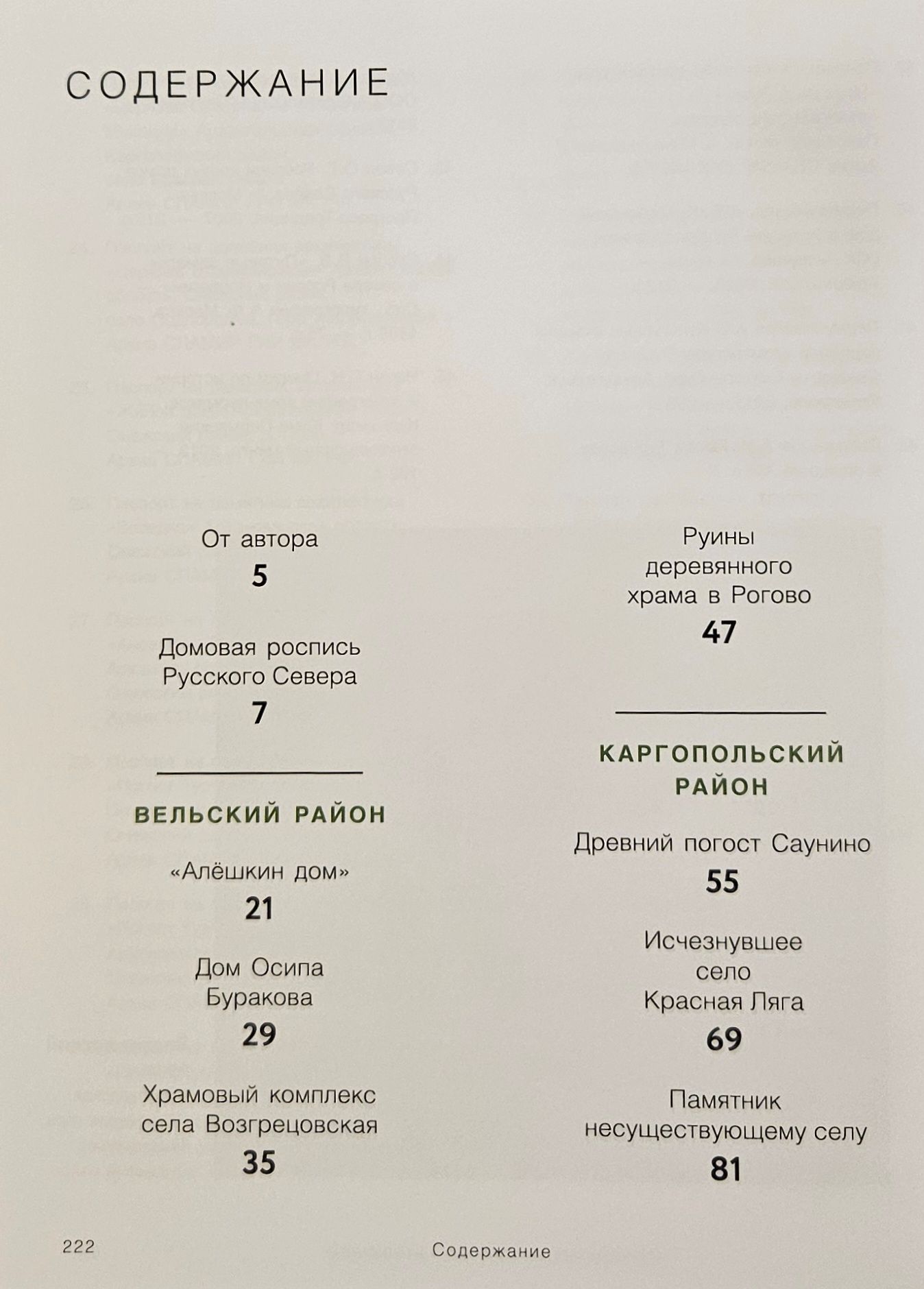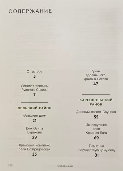 Izdevumā Jūs iepazīstinās ar interesantiem ziemeļu arhitektūras pieminekļiem: spilgtu un oriģinālu mājas gleznojumu, muižiņas, kas glabā bijušās luksusa pēdas, un tešu ansambļiem ar kubu un telšu baznīcām, kas slejas virs zemes kā milži. Daudzi arhitektūras dārgakmeņi ir pamestā vai saglabātā stāvoklī, bet tie nezaudē savu šarmu un nozīmi.