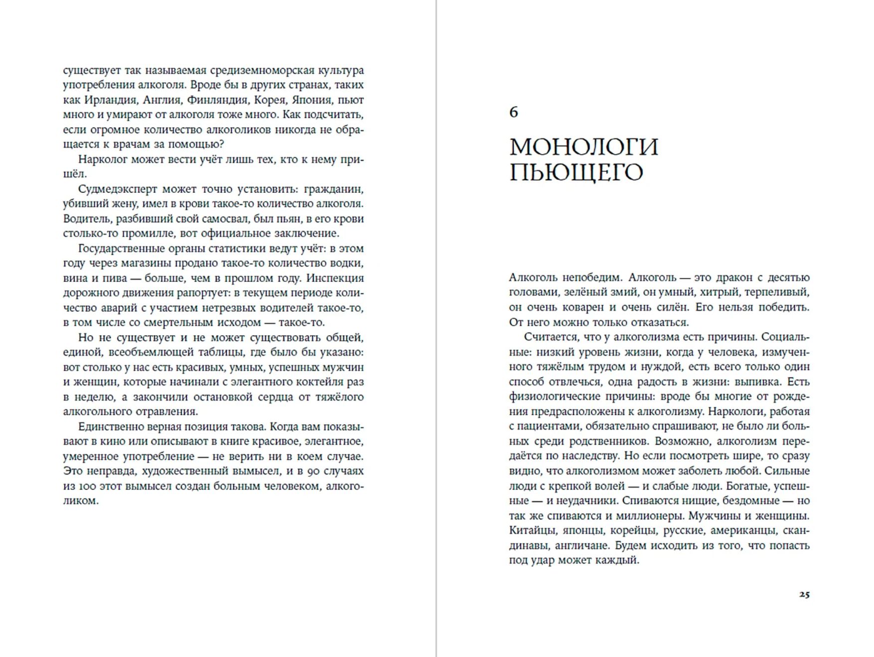 Autors papildina savas personīgās pieredzes stāstu ar pārdomām par alkohola kultūru Krievijā, pēta atkarības psiholoģiskos, sociālos un fizioloģiskos aspektus un veidus, kā ar to cīnīties. Šī skarbā un patiesā grāmata paver ceļu uz skaidrību bez moralizēšanas, piespiešanas un vainas apziņas. Tā palīdzēs tiem, kas vēlas izvairīties no bieži pieļautām kļūdām un beidzot pārvarēt slimību, kā arī atkarīgo cilvēku tuviniekiem.