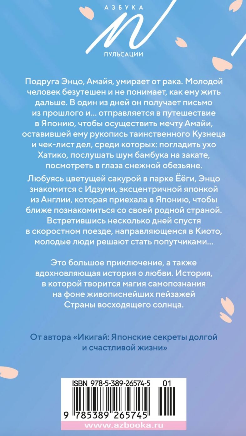 Enzo draudzene Amaija mirst no vēža. Jaunietis ir nemierināms un nesaprot, kā dzīvot tālāk. Kādu dienu viņš saņem vēstuli no pagātnes un... dodas ceļojumā uz Japānu, lai piepildītu Amajas sapni, kura viņam atstāja noslēpumainā Kalēja manuskriptu un veicamo darbu kontrolsarakstu, tostarp Hačiko auss glāstīšanu, bambusa skaņas klausīšanos saulrietā, skatīšanos sniega pērtiķa acīs. Apbrīnojot ķiršu ziedus Jojogi parkā, Enzo satiek Izumi, ekscentrisku japānieti no Anglijas, kura ieradusies Japānā, lai tuvāk iepazītu savu dzimteni. Pēc dažām dienām tiekoties ātrvilcienā, kas dodas uz Kioto, jaunieši nolemj kļūt par ceļabiedriem...