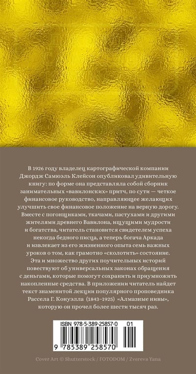 Ceļš uz bagātību ir skaidrs un tiešs gadu tūkstošu gaitā, daudzi cilvēki ir gājuši pa to un sasnieguši labklājību. Ja kāds nepamet novārtā savu gudrību un apgūst zelta likumus, šo ceļu var iet ikviens. 1926. gadā kartēšanas uzņēmuma īpašnieks Džordžs Semjuels Klasons izdeva pārsteidzošu grāmatu: pēc formas tas bija izklaidējošu "babiloniešu" līdzību krājums, bet pēc būtības tas bija skaidrs finanšu ceļvedis, kas virzīja uz pareizā ceļa tos, kuri vēlējās uzlabot savu finansiālo stāvokli. Kopā ar šoferiem, audējiem, ganiem un citiem senās Bābeles iemītniekiem, kas meklē gudrību un bagātību, lasītājs kļūst par kādreiz nabaga rakstu mācītāja, tagad bagātā Arkāda panākumu liecinieku un no savas dzīves pieredzes apgūst septiņas svarīgas atziņas, kā gudri "nopelnīt" bagātību. Šis un daudzi citi pamācoši stāsti vēsta par universālajiem likumiem, kā rīkoties ar naudu, kas palīdzēs ietaupīt un palielināt uzkrājumus. Grāmata izdota jaunā tulkojumā. Pielikumā lasītājs atradīs populārā sludinātāja Rasela Konvela (1843-1925) slavenās lekcijas "Dimanta lauki" tekstu, ko viņš nolasīja vairāk nekā sešus tūkstošus reižu.