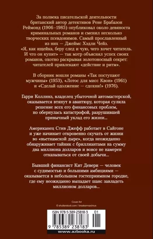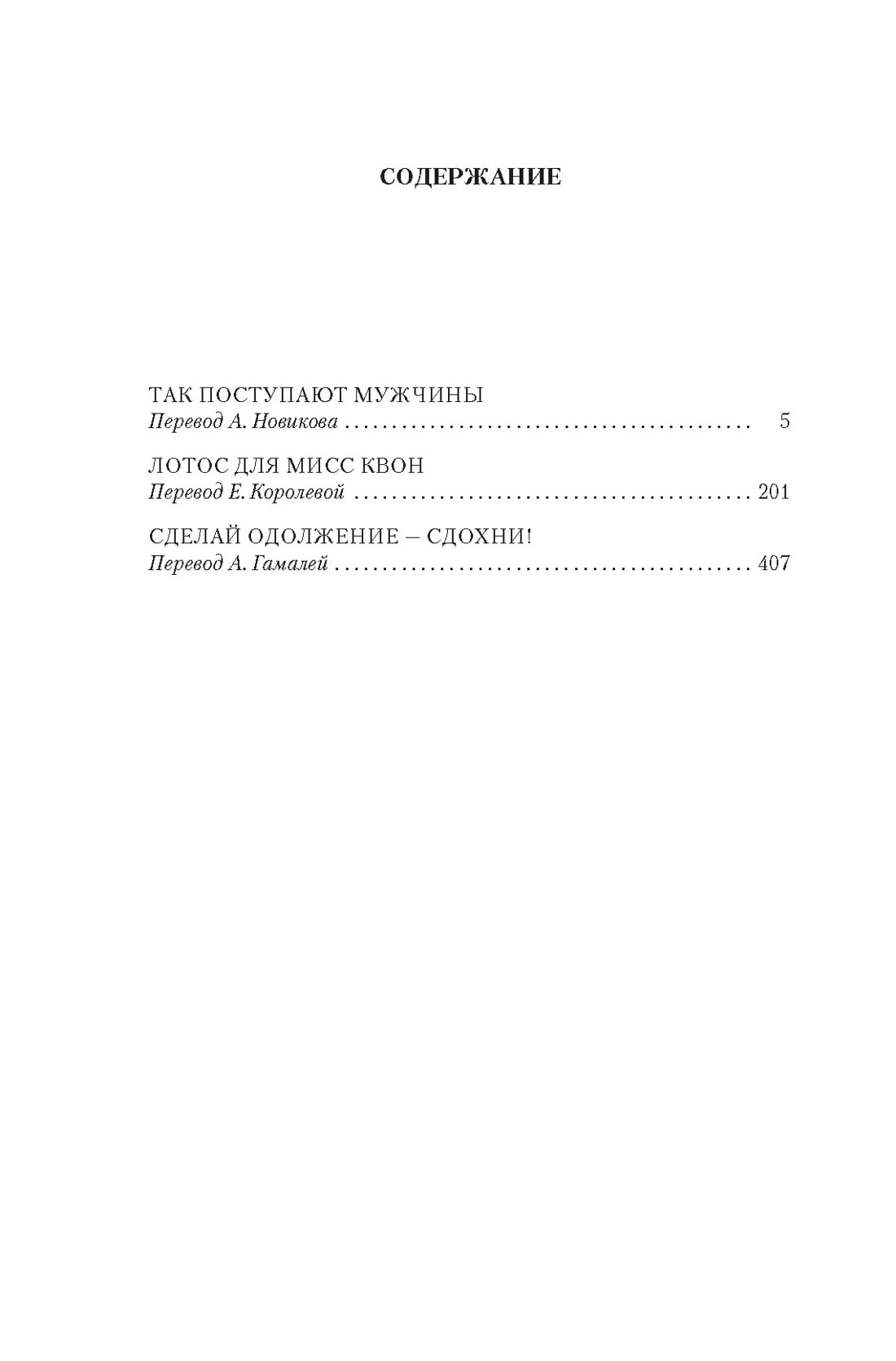 Britu detektīvromānu autors Renē Brabazons Reimonds (1906-1985) pusgadsimta laikā publicēja aptuveni deviņdesmit kriminālromānus un nomainīja vairākus radošos pseidonīmus. Slavenākais no tiem ir Džeimss Hadlijs Čezs. "Es kā asinskrējējs ieraugu pēdas un nojaušu, ko lasītājs vēlas. Un ko viņš nopirks," - tā maestro skaidroja savu romānu panākumus, labprāt atklājot zeltlietas noslēpumu: lasītājus piesaista "darbība un ritms". Krājumā iekļauti romāni "Tā dara vīrieši" (1953), "Lotoss kundzei Kvoņai" (1961) un "Dariet man pakalpojumu - mirstiet!". (1976). Harijs Kolinss, nerentabla autoservisa īpašnieks, tiek ievilkts piedzīvojumā, kas solīja atrisināt visas viņa finansiālās problēmas, bet izrādījās katastrofa, kas sagrāva ierasto dzīvesveidu... Amerikānis Stīvs Džefs strādā Saigonā un sāk atklāti garlaikoties ar dzīvi "vjetnamiešu bedrē", kad pēkšņi atklāj divu miljonu dolāru vērtu dimantu krātuvi un negrasās atteikties no sava laupījuma... Bijušais finansists Kīts Deverijs - vīrietis ar kriminālu pagātni un lielām ambīcijām - nonāk mazā viesmīlīgā pilsētiņā, kur viņam negaidīti rodas iespēja iegūt savā īpašumā miljonu dolāru...