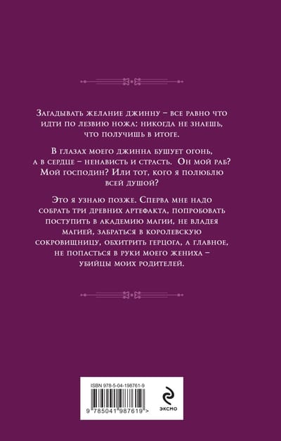 Lai glābtu savu ģimeni, es nolēmu spert izmisuma soli un noslēdzu darījumu ar džinu. Izteikt vēlēšanos džinsam ir kā staigāt pa naža asmeni: nekad nevar zināt, ko beigās iegūsi, jo džinsi ir viltīgi un ļauni pret visu cilvēci. Mana džinsa acīs plosās uguns, un viņa sirdī ir naids un kaisle. Kas mani sagaida? Viņš ir mans vergs. Vai mans kungs? Vai tas, kuru mīlu no visas dvēseles?