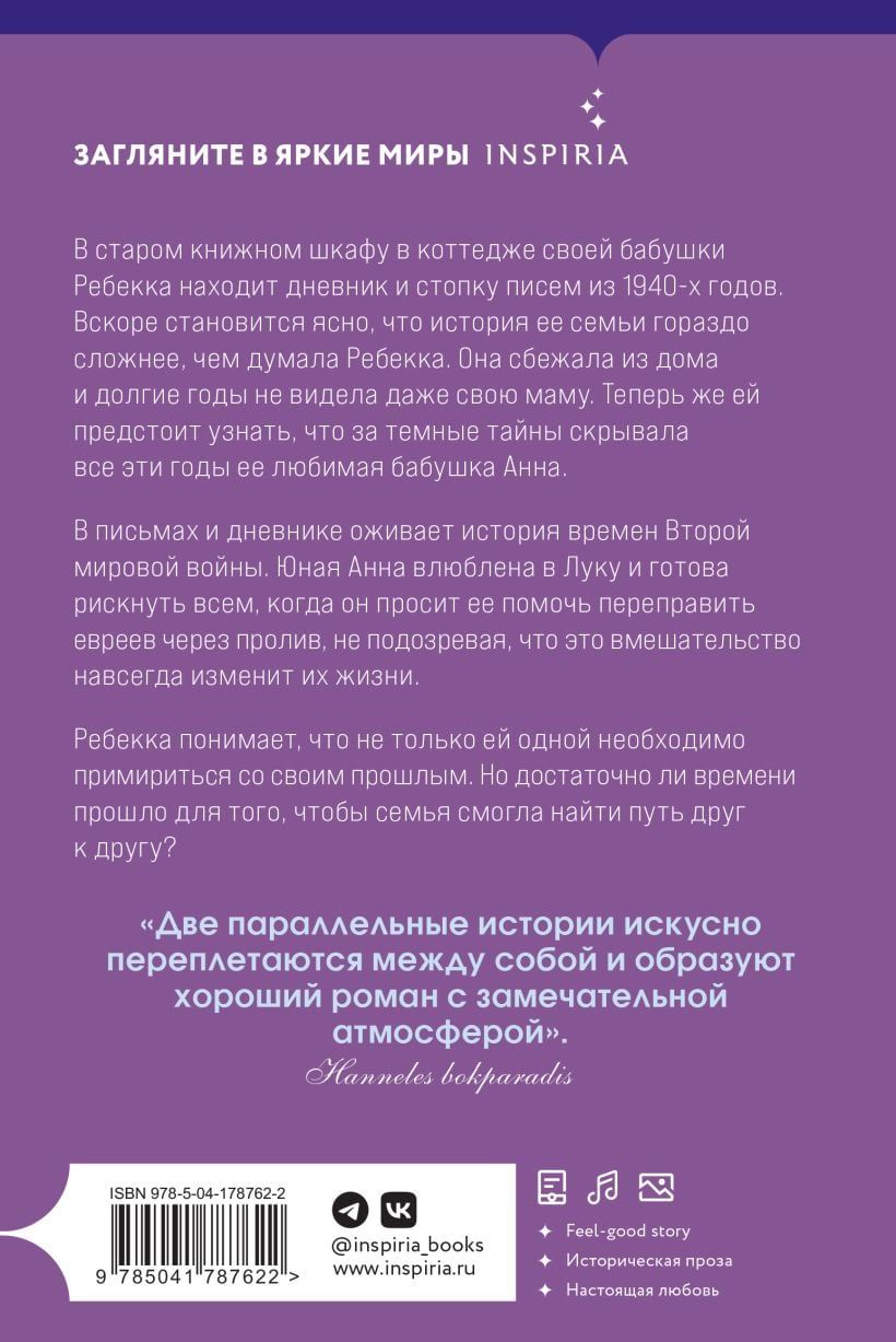 . Vēstulēs un dienasgrāmatā atdzīvojas stāsts par Otro pasaules karu. Jaunā Anna ir iemīlējusies Lukā un ir gatava riskēt ar visu, kad viņš lūdz viņu palīdzēt pārvest ebrejus pāri jūras šaurumam, nenojaušot, ka šī iejaukšanās uz visiem laikiem mainīs viņu dzīves. Rebeka saprot, ka viņa nav vienīgā, kurai jāsamierinās ar savu pagātni. Bet vai ir pagājis pietiekami ilgs laiks, lai ģimene atrastu ceļu atpakaļ viens pie otra?"
