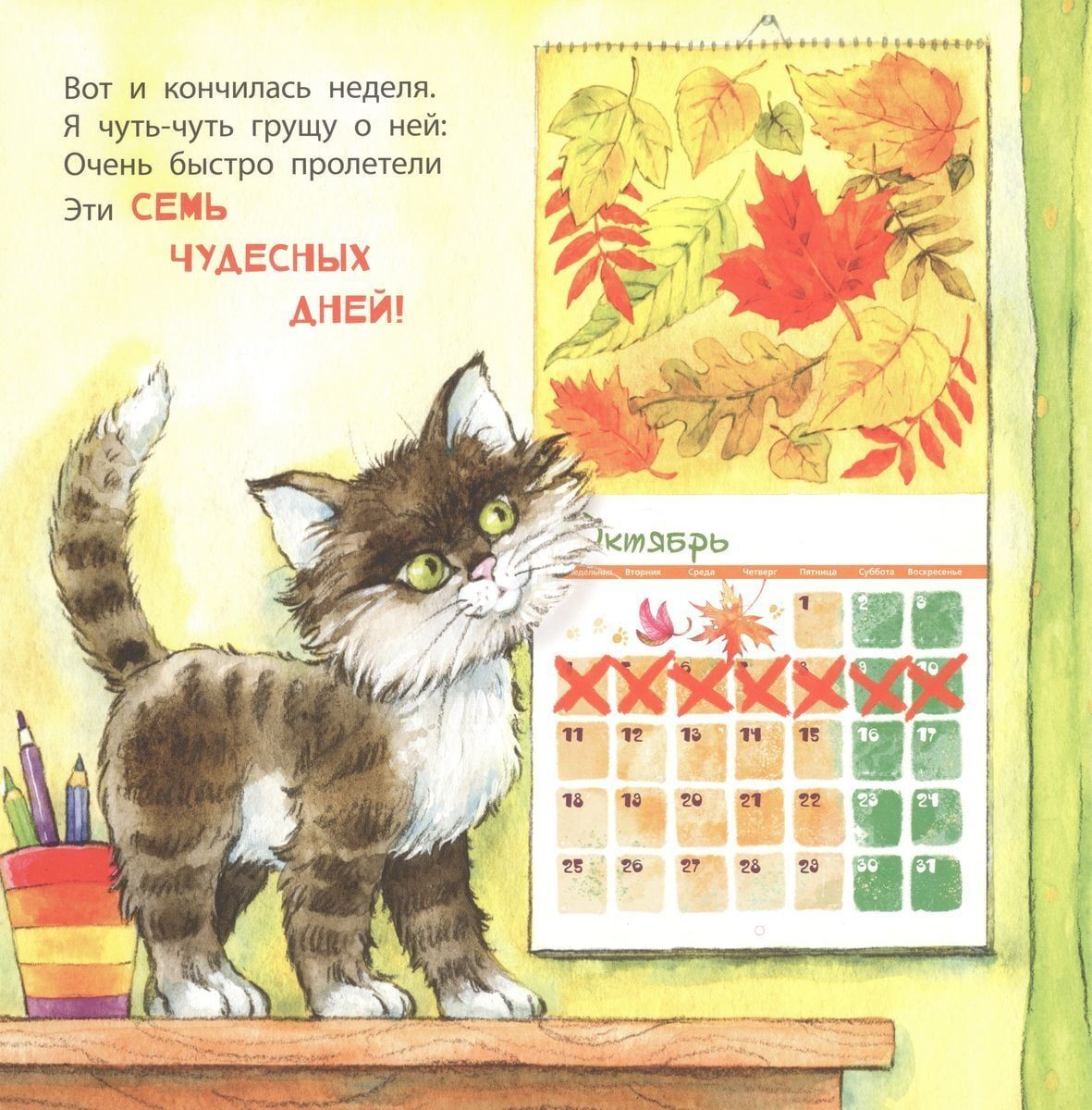 Klausoties Jeļenas Stepanovas jautros dzejoļus un skatoties Jeļenas Volodkinas jaukos zīmējumus, bērni viegli atcerēsies nedēļas dienu nosaukumus un sapratīs, cik svarīgi ir katru dienu darīt labus darbus. Grāmata ir iespiesta uz bieza kartona. Pieaugušajiem lasīt bērniem.