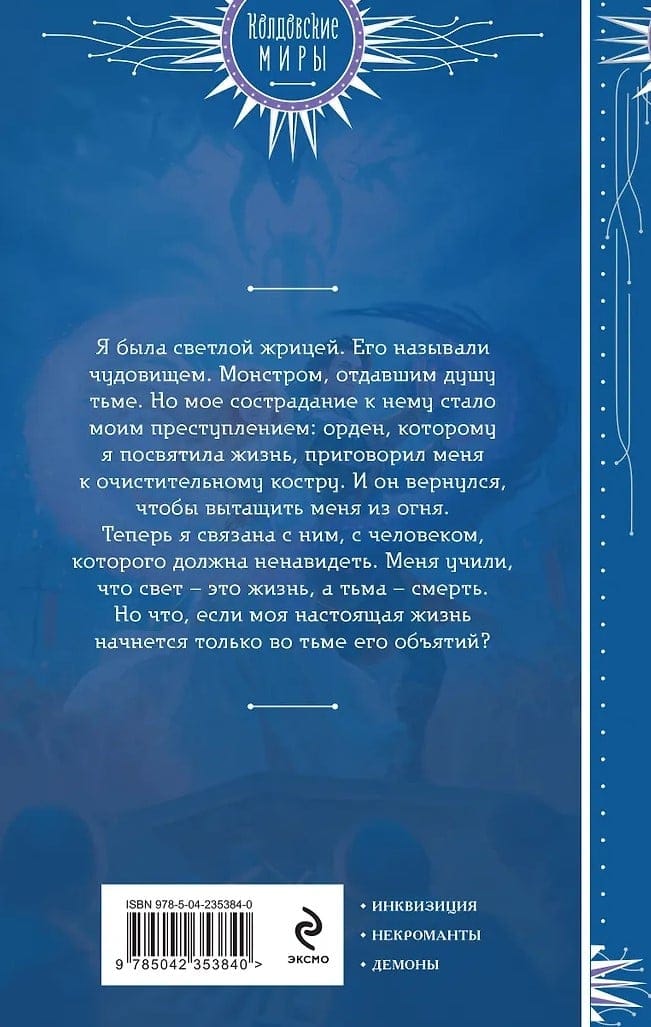 Es biju gaismas priesteriene. Viņu sauca par briesmoni. Briesmoni, kas atdeva savu dvēseli tumsai. Bet mana līdzjūtība pret viņu kļuva par manu noziegumu: ordenis, kuram es veltīju savu dzīvi, notiesāja mani uz šķīstošu sārtu. Un viņš atgriezās, lai izvilktu mani no uguns. Tagad esmu saistīta ar viņu, ar vīrieti, kuru man jāienīst. Man mācīja, ka gaisma ir dzīvība, un tumsa ir nāve. Bet ja nu mana patiesā dzīve sākas tikai viņa apskāviena tumsā?
