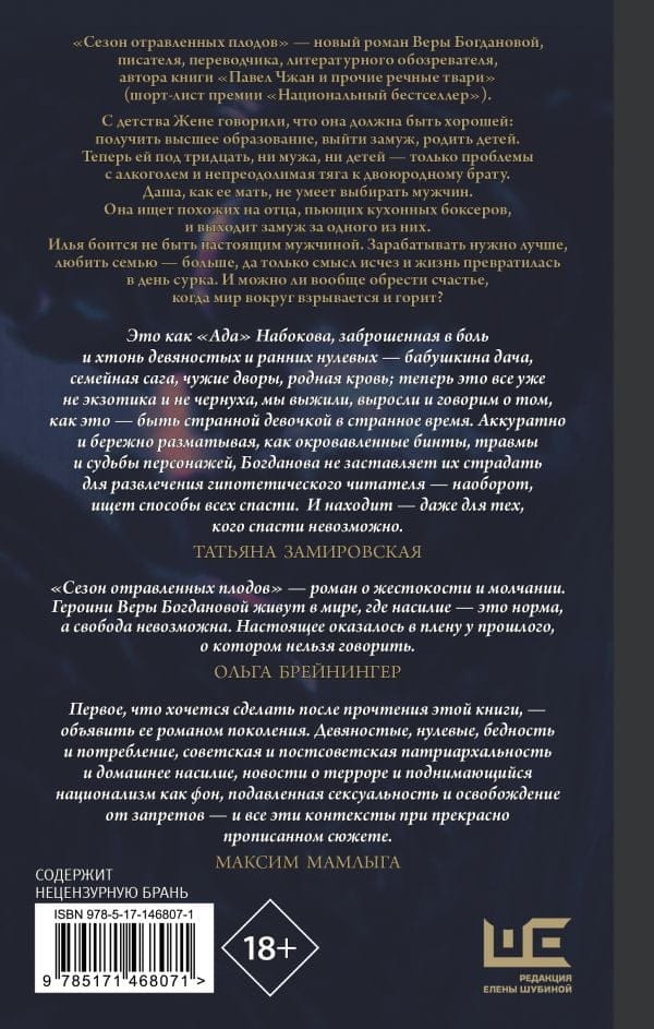 Kopš agras bērnības Ženijai tika stāstīts, ka viņai jābūt labai: jāstudē par tulkotāju, jāprecas, jādzemdē bērni. Tagad viņai ir trīsdesmit, nav ne vīra, ne bērnu - tikai problēmas ar alkoholu un neatvairāma pievilkšanās brālēna pusbrālim. Daša, tāpat kā viņas māte, nezina, kā izvēlēties vīriešus. Viņa meklē tēvam līdzīgus, dzerošus virtuves bokserus un apprecas ar vienu no viņiem. Iļja baidās, ka nebūs īsts vīrietis. Labāk pelnīt, vairāk mīlēt savu ģimeni, bet tikai jēga ir pazudusi un dzīve ir pārvērtusies par Groundhog Day. "Saindēto augļu sezona" - par mūsdienu trīsdesmitgadnieku paaudzi, kas uzaugusi deviņdesmito gadu haosā un deviņdesmito gadu teroraktu laikā. Romāna varoņi baidās dzīvot savu dzīvi, un vai ir iespējams atrast laimi, kad apkārtējā pasaule sprāgst un deg?